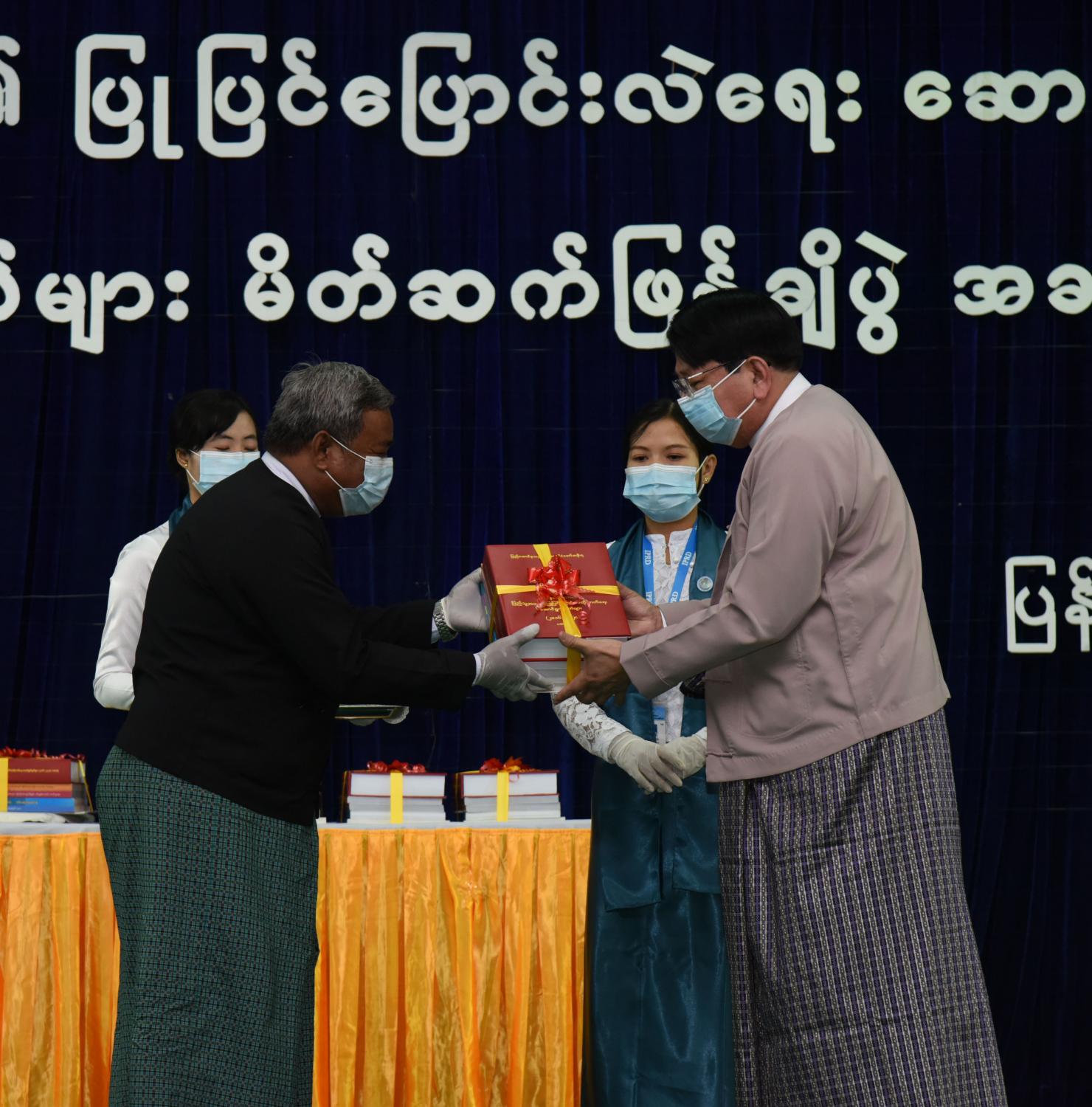 ထို့နောက် မှတ်တမ်းစာအုပ်များကို ပြည်ထောင်စုဝန်ကြီး ဒေါက်တာဖေမြင့်က ဥပဒေပြုရေးမဏ္ဍိုင် ကိုယ်စား ပြည်ထောင်စုလွှတ်တော်ရုံး အမြဲတမ်းအတွင်းဝန် ဦးကျော်စိုးအား လည်းကောင်း၊ အုပ်ချုပ်ရေးမဏ္ဍိုင်ကိုယ်စား ရင်းနှီးမြှုပ်နှံမှုနှင့် နိုင်ငံခြားစီးပွား ဆက်သွယ်ရေးဝန်ကြီးဌာန အမြဲတမ်းအတွင်းဝန် ဦးအောင်နိုင်ဦး အားလည်းကောင်း၊ တရားစီရင်ရေးမဏ္ဍိုင် ကိုယ်စား ပြည်ထောင်စုရှေ့နေချုပ်ရုံး ဒုတိယအမြဲတမ်း အတွင်းဝန် ဦးသန့်စင်အား လည်းကောင်း၊ တပ်မတော်သတင်းမှန် ပြန်ကြားရေးအဖွဲ့ကိုယ်စား တပ်မတော်ကာကွယ်ရေး ဦးစီးချုပ်ရုံးမှ ဗိုလ်မှူးကြီး စိုးသန်းအားလည်းကောင်း၊ အမျိုးသား မှတ်တမ်းများ မော်ကွန်းတိုက်ဦးစီးဌာနမှ ဒုတိယညွှန်ကြားရေးမှူးချုပ် ဒေါက်တာ မျိုးမင်းကြည်ဝင်း အားလည်းကောင်း၊ အမျိုးသား စာကြည့်တိုက်မှ ညွှန်ကြားရေးမှူး ဒေါ်မြဦး အားလည်းကောင်း၊ သတင်းမီဒီယာများ ကိုယ်စား လျှပ်တပြက်ဂျာနယ်မှ နေပြည်တော် တာဝန်ခံ ရဲရဲ (ပျဉ်းမနား) အားလည်းကောင်း ပေးအပ်သည်။