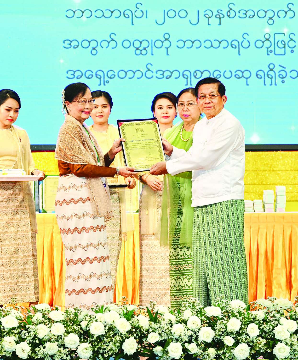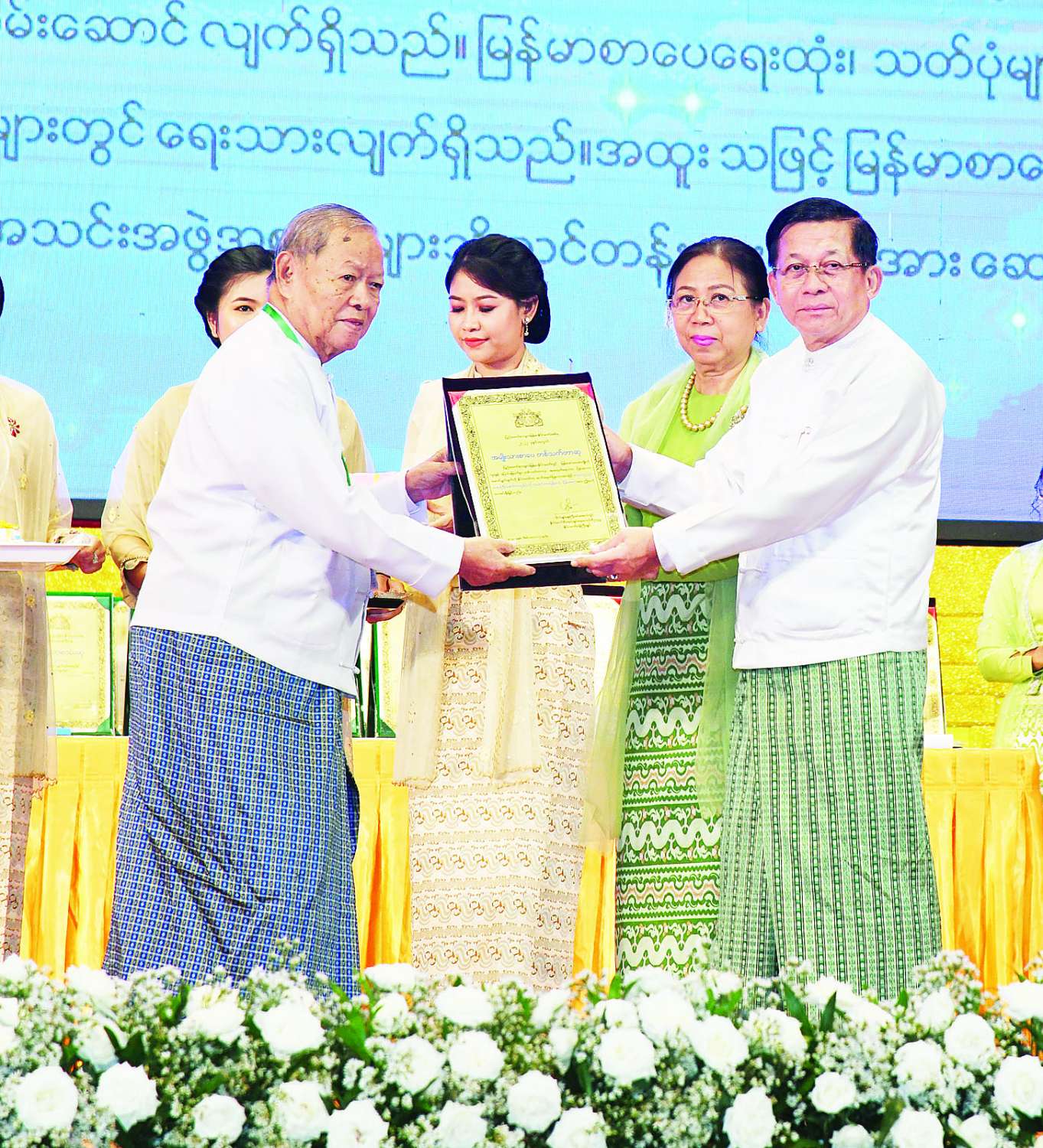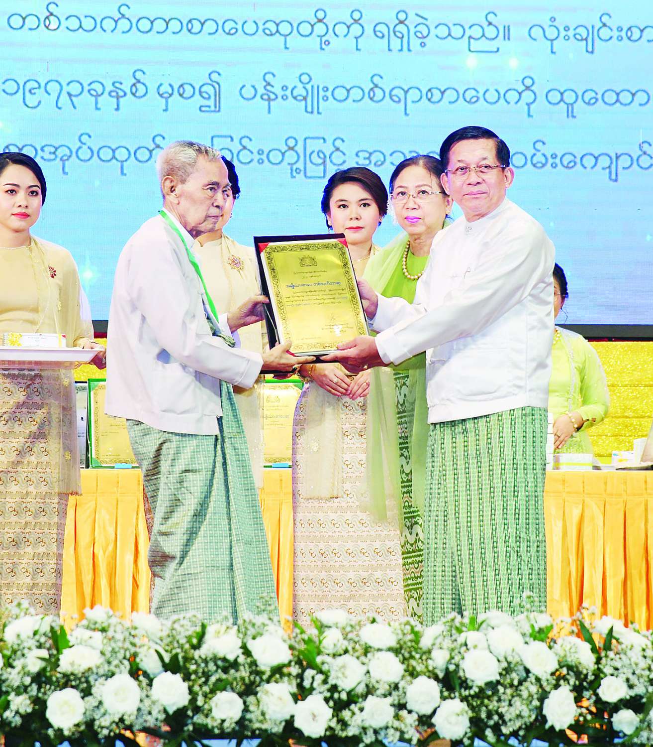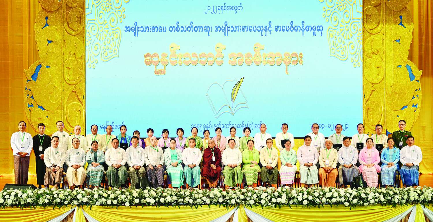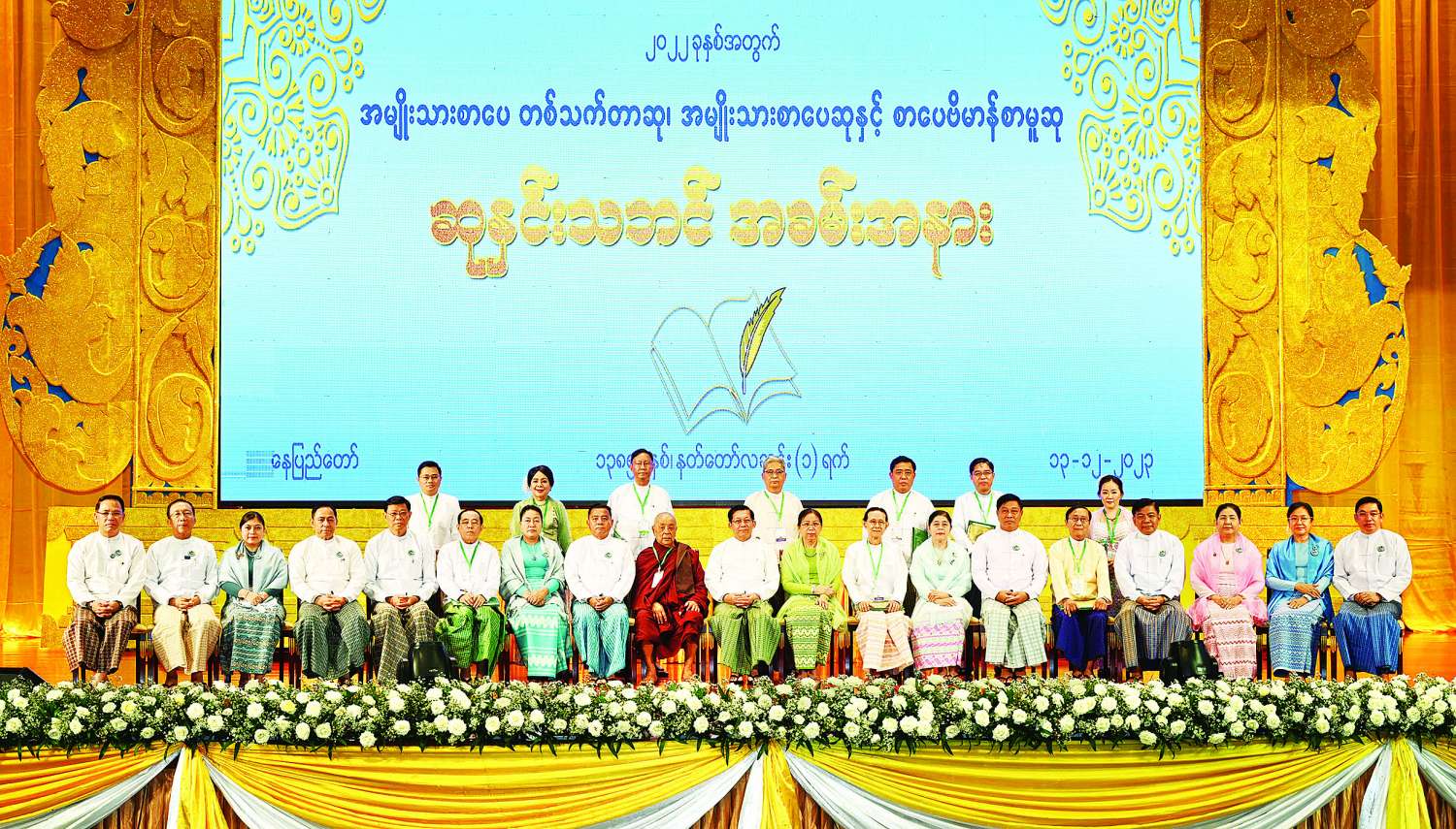 ၂၀၂၂ ခုနှစ်အတွက် အမျိုးသားစာပေတစ်သက်တာဆု၊ အမျိုးသားစာပေဆုနှင့်စာပေဗိမာန်စာမူဆု ဆုနှင်းသဘင်အခမ်းအနားကို ယနေ့နံနက်ပိုင်းတွင်နေပြည်တော်ရှိ အပြည်ပြည်ဆိုင်ရာကွန်ဗင်းရှင်းဗဟိုဌာန-၂ ၌ ကျင်းပပြုလုပ်ရာ နိုင်ငံတော်စီမံအုပ်ချုပ်ရေးကောင်စီဥက္ကဋ္ဌ နိုင်ငံတော်ဝန်ကြီးချုပ် ဗိုလ်ချုပ်မှူးကြီးမင်းအောင်လှိုင်နှင့်ဇနီးဒေါ်ကြူကြူလှတို့ တက်ရောက်၍ စာပေဆုများ ပေးအပ်ချီးမြှင့်သည်။