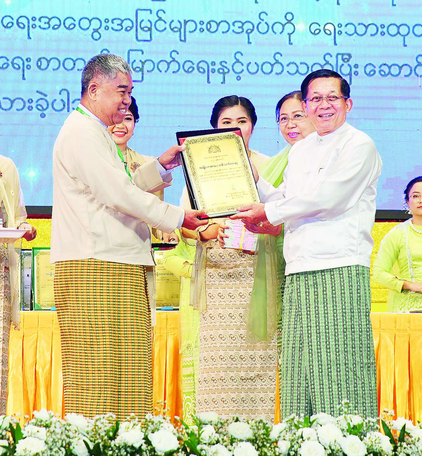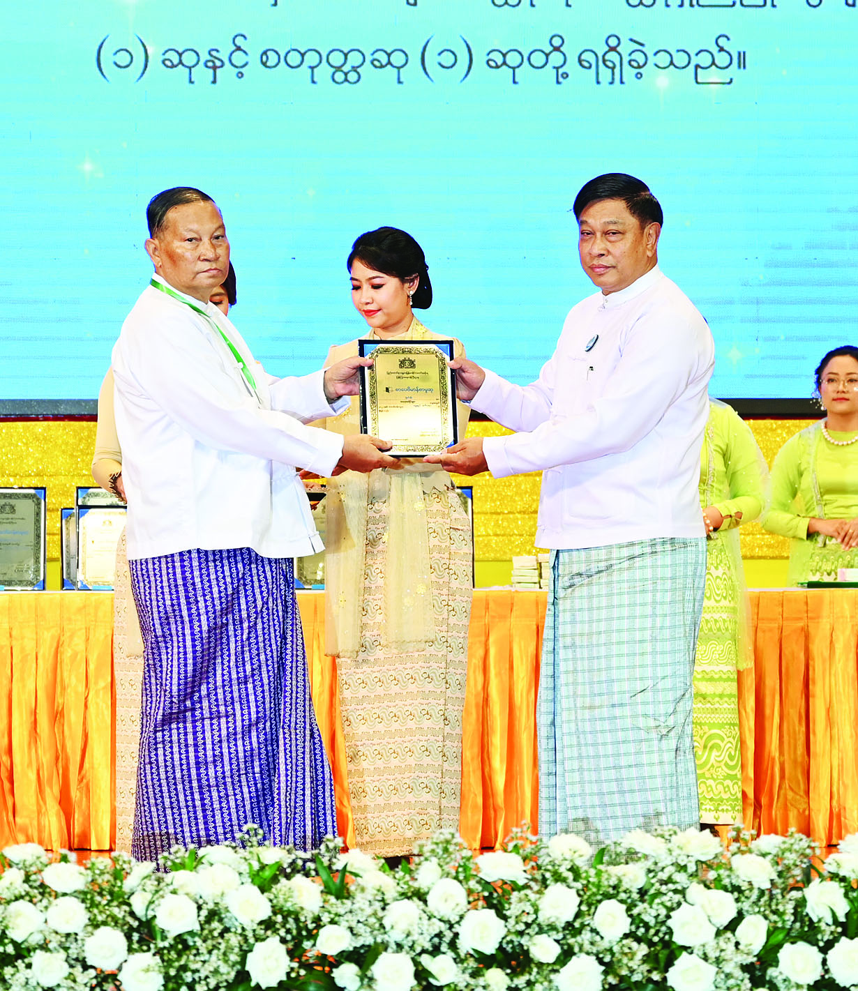အခမ်းအနားမစတင်မီ နိုင်ငံတော်စီမံအုပ်ချုပ်ရေးကောင်စီဥက္ကဋ္ဌ နိုင်ငံတော်ဝန်ကြီးချုပ်နှင့် အခမ်းအနားတက်ရောက်လာကြသူများသည် မြန်မာအပြည်ပြည်ဆိုင်ရာ ကွန်ဗင်းရှင်း ဗဟိုဌာန-၂ မြေညီထပ်၌ ခင်းကျင်းပြသထားသည့် ဆုရရှိသူများ၏ အတ္ထုပ္ပတ္တိ၊ ဓာတ်ပုံ၊ ဆုရစာအုပ်များနှင့် စာအုပ်စာစောင်များကို လှည့်လည်ကြည့်ရှုကြသည်။