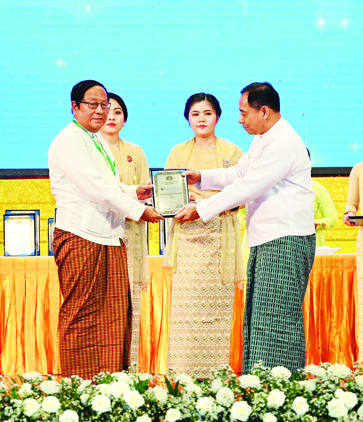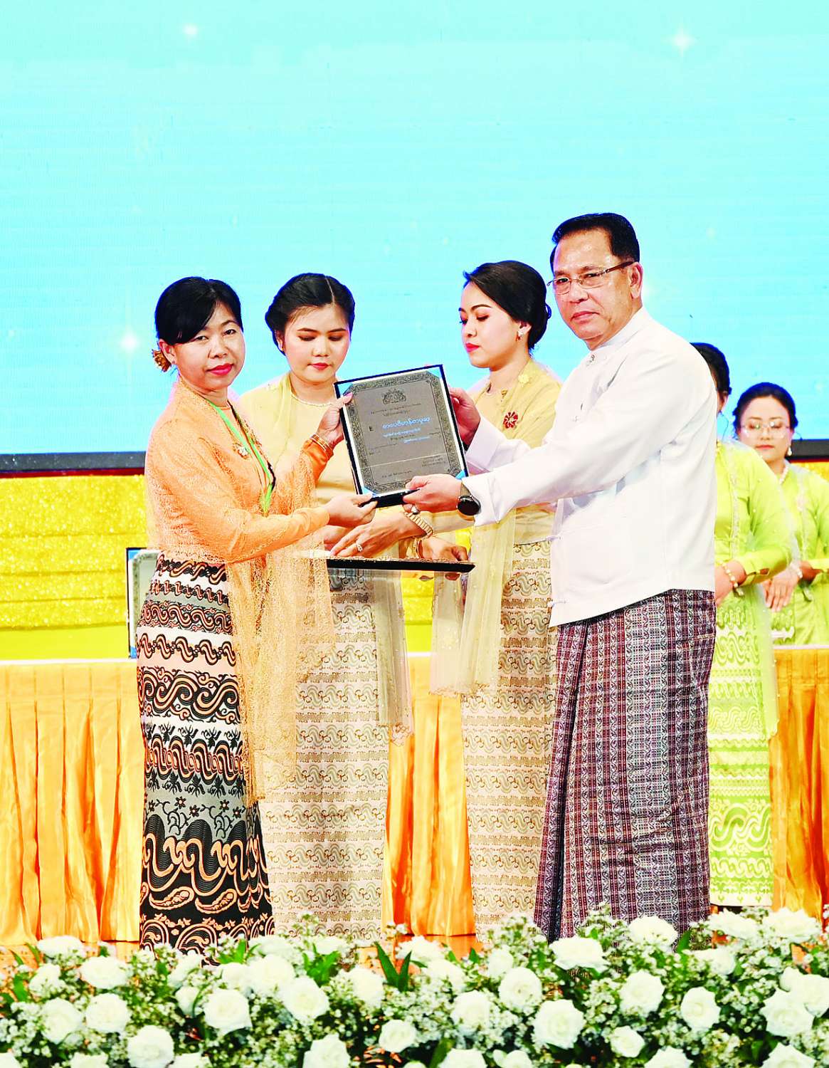 ထို့နောက် ကောင်စီတွဲဖက်အတွင်းရေးမှူး ဒုတိယဗိုလ်ချုပ်ကြီး ရဲဝင်းဦး၊ ကောင်စီဝင်များဖြစ်ကြသည့် ဗိုလ်ချုပ်ကြီး မြထွန်းဦး၊ ဗိုလ်ချုပ်ကြီး တင်အောင်စန်း၊ ဗိုလ်ချုပ်ကြီး မောင်မောင်အေး၊ ဒုတိယဗိုလ်ချုပ်ကြီး ရာပြည့်၊ ဒုတိယဗိုလ်ချုပ်ကြီး ညိုစော၊ ပြည်ထောင်စုဝန်ကြီး ဦးဝင်းရှိန်နှင့် ဦးမောင် မောင်အုန်းတို့က အမျိုးသားစာပေဆု ရရှိသူများနှင့် စာပေဗိမာန်စာမူဆု ရရှိသူများကို ဆုများပေးအပ် ချီးမြှင့်ကြသည်။
