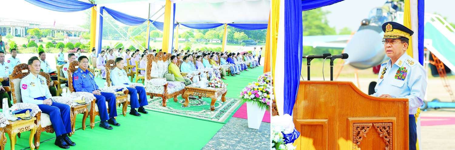 တပ်မတော်(လေ)အနေဖြင့် သမိုင်းအဆက်ဆက် တိုင်းပြည်တာဝန်များကို ကျရာအခန်းကဏ္ဍမှ ကျေပွန်အောင် ထမ်းဆောင်နိုင်ခဲ့သကဲ့သို့ ဒို့တာဝန်အရေးသုံးပါးကို အစဉ်ဦးထိပ်ထားပြီး နိုင်ငံတော်ဖွံ့ဖြိုးတိုးတက်ရေးနှင့် နိုင်ငံတော်ကာကွယ်ရေးလုပ်ငန်းများတွင်တစ်တပ်တစ်အား ပါဝင်ဆောင်ရွက်ပြီး တပ်မတော်၏ဂုဏ်ကို မြှင့်တင်ဆောင်ရွက်ကြရန်၊ ယနေ့တပ်တော်ဝင်ပေးလိုက်သည့် လေယာဉ်များကို စစ်သည်တော်ကျင့်ဝတ်ပါ “ မိမိလက်နက်ကိုခင်မင်မြတ်နိုးပါ” ဆိုသည့်အတိုင်း စည်းကမ်းစနစ်တကျ မြတ်နိုးစွာကိုင်တွယ်ပျံသန်းပြီး တပ်မတော်၏ဂုဏ်ကို မြှင့်တင်ဆောင်ရွက်သွားကြရန်၊ တပ်တွင်းစည်းလုံးညီညွတ်ရေး၊ တပ်ပြင်စည်းရုံးရေးတို့ကို အမြဲခိုင်မာအောင် တည်ဆောက်သွားပြီး တပ်မတော်၏ ကောင်းမြတ်သည့် အစဉ်အလာကောင်းများကို သားစဉ်မြေးမြစ် မျိုးဆက်သစ်များက အသက်နှင့် ထပ်တူထိန်းသိမ်းစောင့်ရှောက်ကာ ကမ္ဘာတည်သရွေ့မြန်မာတည်စေရန် အားလုံးဝိုင်းဝန်းဆောင်ရွက်သွားကြရန် တိုက်တွန်းလိုကြောင်း ပြောကြားသည်။