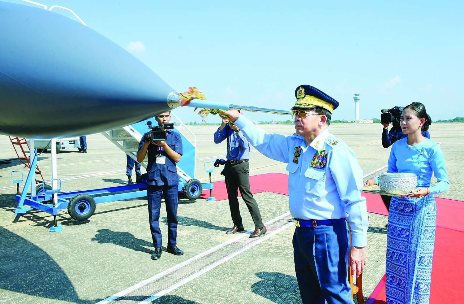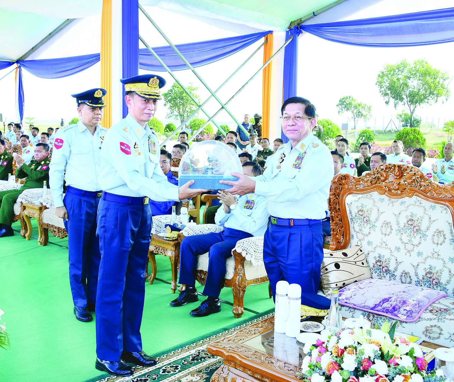 နိုင်ငံတော်စီမံအုပ်ချုပ်ရေးကောင်စီဥက္ကဋ္ဌ တပ်မတော်ကာကွယ်ရေးဦးစီးချုပ် ဗိုလ်ချုပ်မှူးကြီး မင်းအောင်လှိုင် တပ်မတော်(လေ) ဖွဲ့စည်းတည်ထောင်မှု (၇၆) နှစ်မြောက် နှစ်ပတ်လည်နေ့အထိမ်းအမှတ် လေယာဉ်များ တပ်တော်ဝင်အခမ်းအနားသို့ တက်ရောက်ချီးမြှင့်