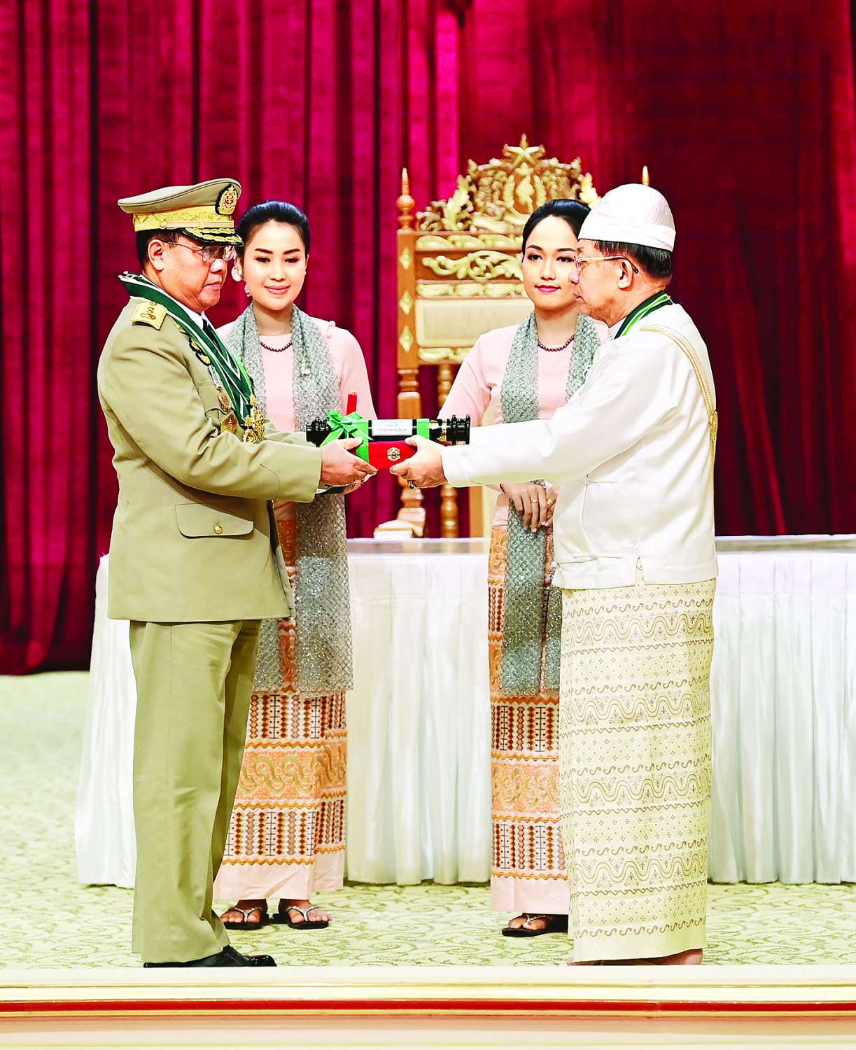(၇၆)နှစ်မြောက်လွတ်လပ်ရေးနေ့အထိမ်းအမှတ် ဂုဏ်ထူးဆောင်ဘွဲ့များ ချီးမြှင့်အပ်နှင်းခြင်းအခမ်းအနားကို နိုင်ငံတော်စီမံအုပ်ချုပ်ရေးကောင်စီဥက္ကဋ္ဌရုံး သဘင်ဆောင်၌ ယနေ့နံနက်ပိုင်းတွင်ကျင်းပရာ နိုင်ငံတော်စီမံအုပ်ချုပ်ရေးကောင်စီဥက္ကဋ္ဌ နိုင်ငံတော်ဝန်ကြီးချုပ် ဗိုလ်ချုပ်မှူးကြီး သတိုးမဟာသရေစည်သူ သတိုးသီရိသုဓမ္မမင်းအောင်လှိုင် တက်ရောက်အမှာစကားပြောကြားပြီး ဂုဏ်ထူးဆောင်ဘွဲ့များ ချီးမြှင့်အပ်နှင်းသည်။