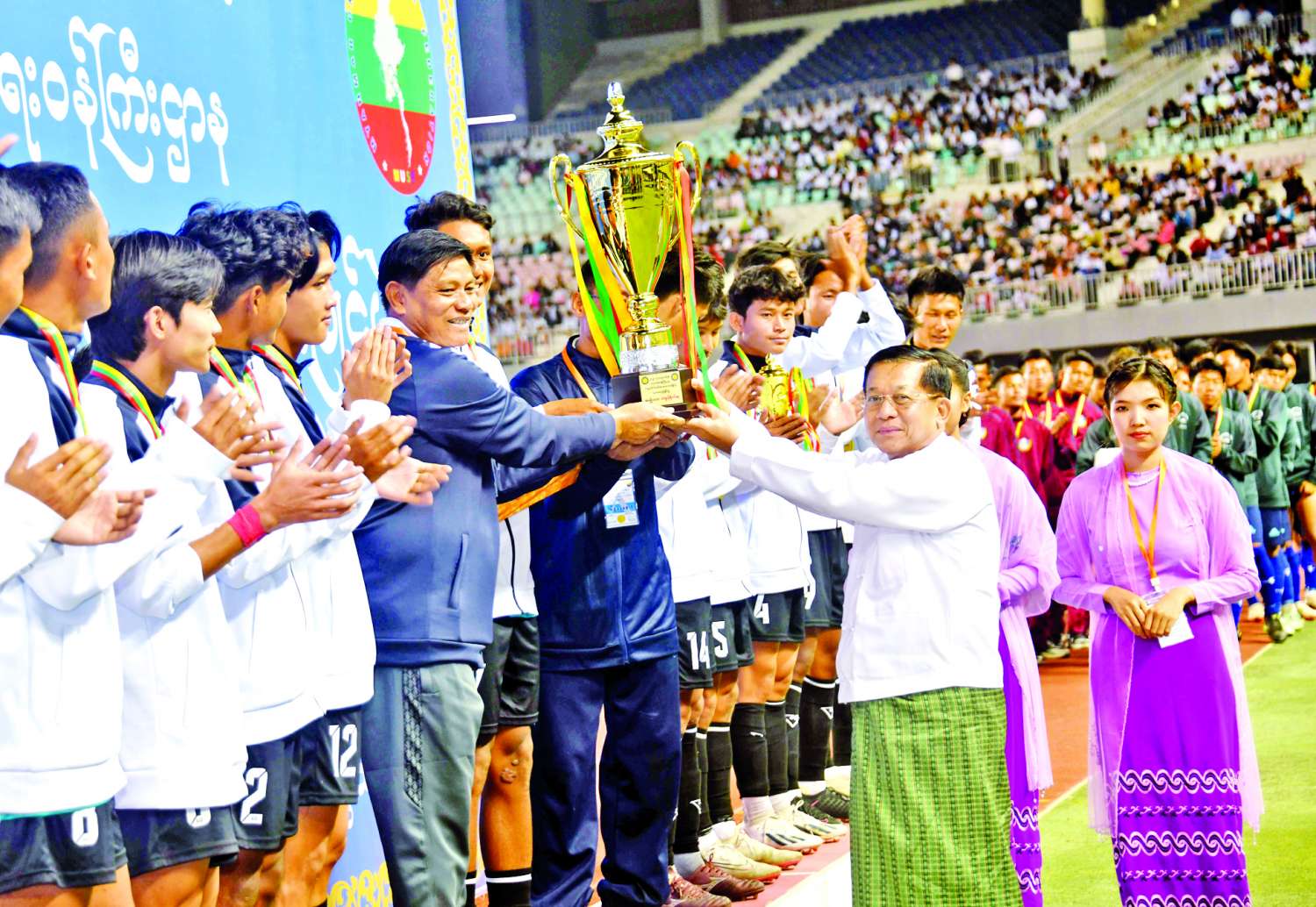 ဦးစွာ နိုင်ငံတော်စီမံအုပ်ချုပ်ရေးကောင်စီဥက္ကဋ္ဌ နိုင်ငံတော်ဝန်ကြီးချုပ်နှင့် တက်ရောက်လာကြသူများသည် ၂၀၂၃-၂၀၂၄ ပညာသင်နှစ်၊ ပညာရေးဝန်ကြီးဌာန တက္ကသိုလ်ပေါင်းစုံဘောလုံးပြိုင်ပွဲ၏ နောက်ဆုံးဗိုလ်လုပွဲအဖြစ် မော်လမြိုင်ဇုန်အသင်းနှင့် မြစ်ကြီးနားဇုန်အသင်းတို့ ယှဉ်ပြိုင်ကစားမှုကို ကြည့်ရှုအားပေးသည်။