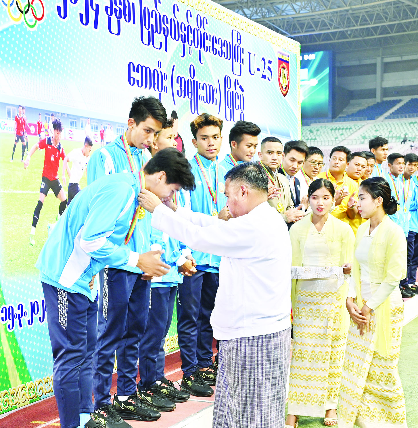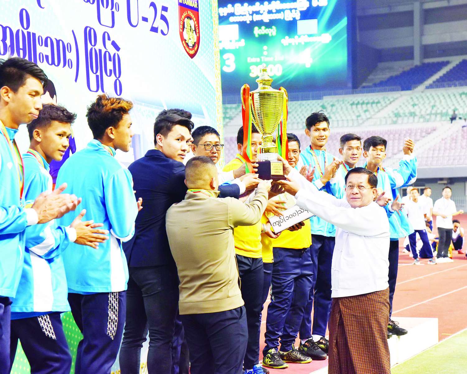 ၂၀၂၄ ခုနှစ်၊ ပြည်နယ်နှင့်တိုင်းဒေသကြီး U-25 ဘောလုံးပြိုင်ပွဲ (အမျိုးသား)ပြိုင်ပွဲ ဗိုလ်လုပွဲနှင့် ဆုချီးမြှင့်ခြင်းအခမ်းအနားကို ယနေ့ညနေပိုင်းတွင် နေပြည်တော်ရှိဝဏ္ဏသိဒ္ဓိဘောလုံးကွင်း၌ ကျင်းပရာ နိုင်ငံတော်စီမံအုပ်ချုပ်ရေးကောင်စီဥက္ကဋ္ဌ နိုင်ငံတော်ဝန်ကြီးချုပ် ဗိုလ်ချုပ်မှူးကြီး မင်းအောင်လှိုင် တက်ရောက်ကြည့်ရှုအားပေးပြီး ဆုများပေးအပ်ချီးမြှင့်သည်။
