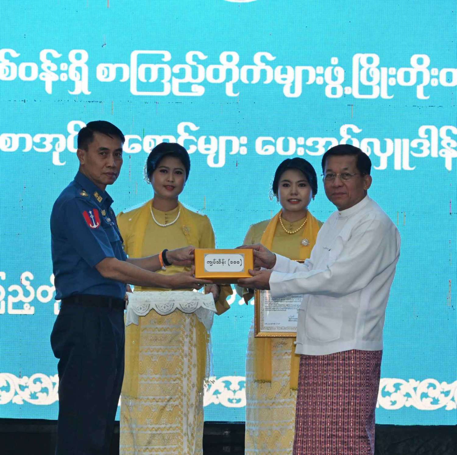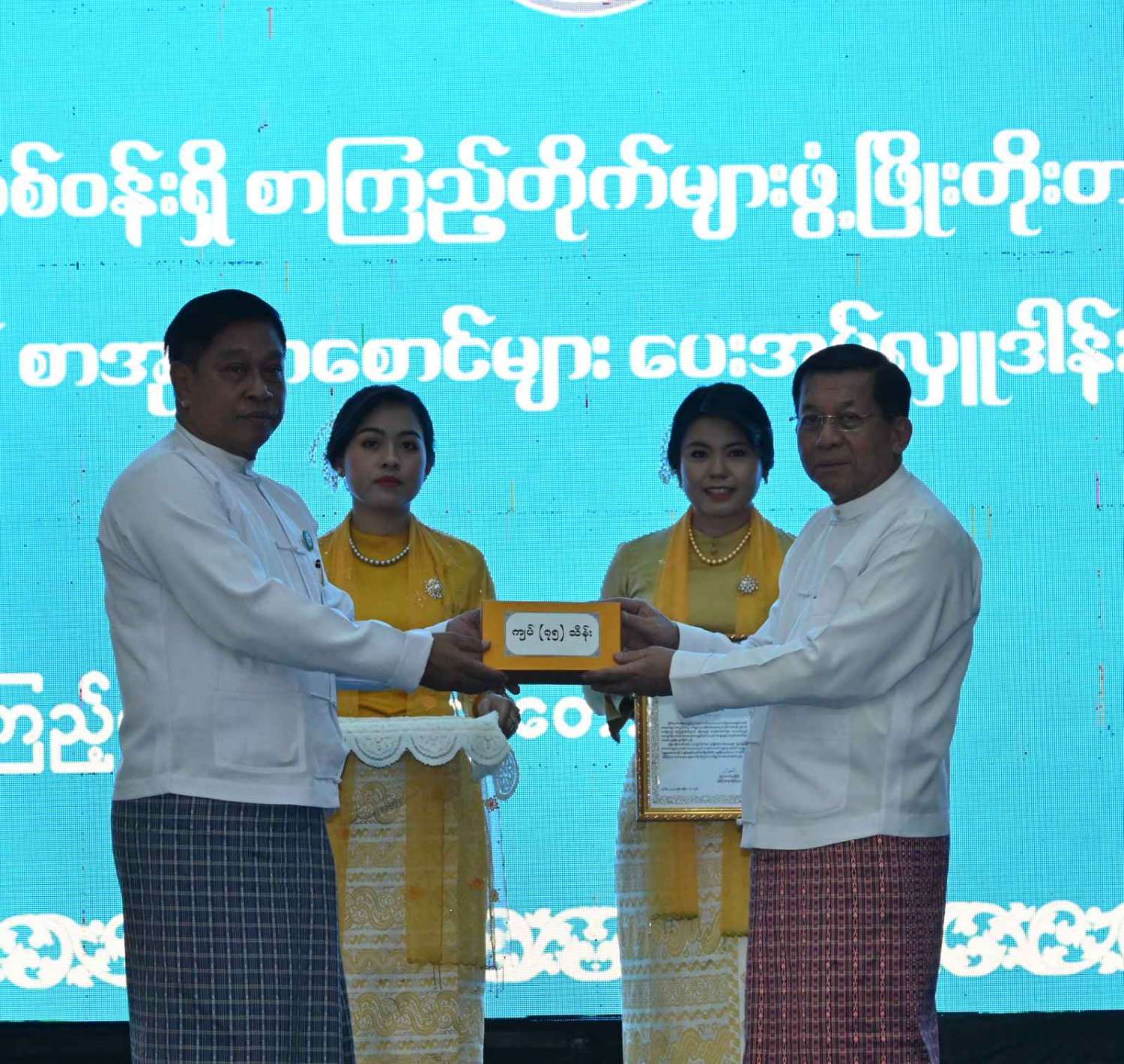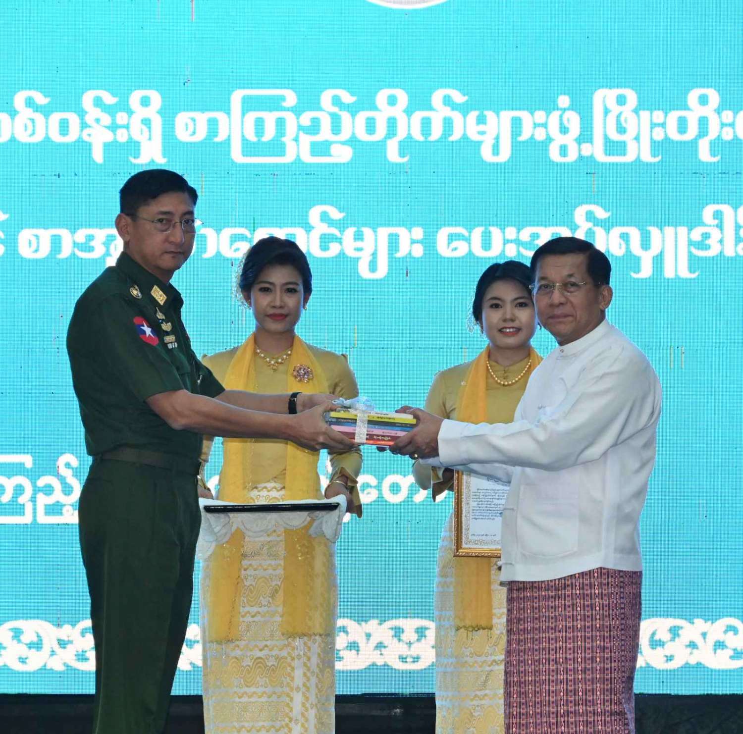 မြန်မာနိုင်ငံတစ်ဝန်းလုံးရှိ စာကြည့်တိုက်များ ဖွံ့ဖြိုးတိုးတက်ရေးအတွက် အလှူငွေနှင့် စာအုပ်စာစောင်များ ပေးအပ်လှူဒါန်းပွဲအခမ်းအနားကို ယနေ့နံနက်ပိုင်းတွင် နေပြည်တော်ရှိ အမျိုးသားစာကြည့်တိုက်၌ ကျင်းပပြုလုပ်ရာ နိုင်ငံတော်စီမံအုပ်ချုပ်ရေးကောင်စီဥက္ကဋ္ဌ နိုင်ငံတော်ဝန်ကြီးချုပ် ဗိုလ်ချုပ်မှူးကြီး မင်းအောင်လှိုင် တက်ရောက်သည်။