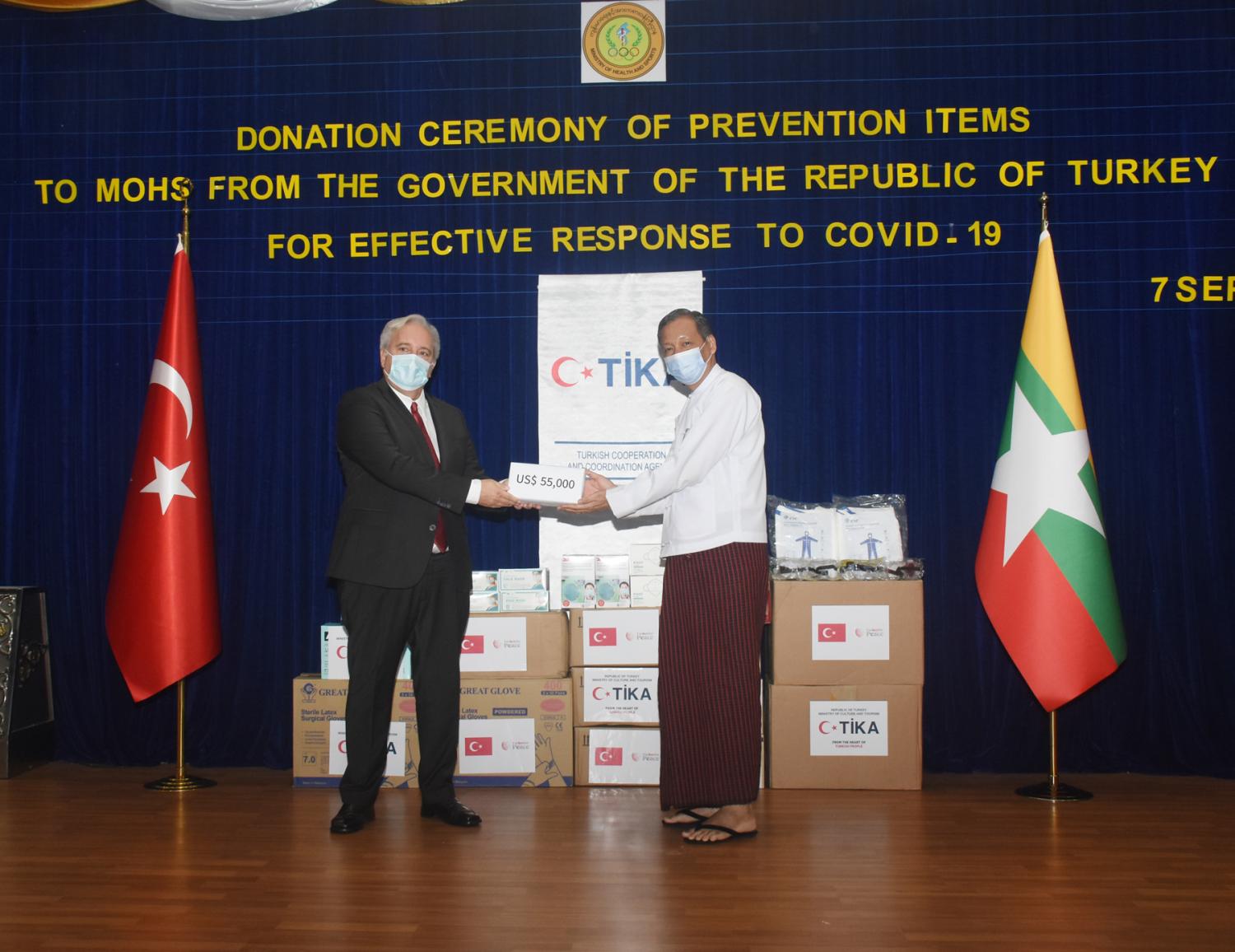 ယင်းနောက် မြန်မာနိုင်ငံဆိုင်ရာ တူရကီသံအမတ်ကြီး H.E. Kerem Divanlioglu က ကိုဗစ်-၁၉ ရောဂါကာကွယ်ရေးသုံး ပစ္စည်းများကို ပေးအပ်လှူဒါန်းရာ ဆေးသုတေသနဦးစီးဌာန ညွှန်ကြား ရေးမှူးချုပ် ပါမောက္ခဒေါက်တာဇော်သန်းထွန်းက လက်ခံရယူပြီး ဂုဏ်ပြုမှတ်တမ်းလွှာ ပြန်လည်ပေးအပ်သည်။