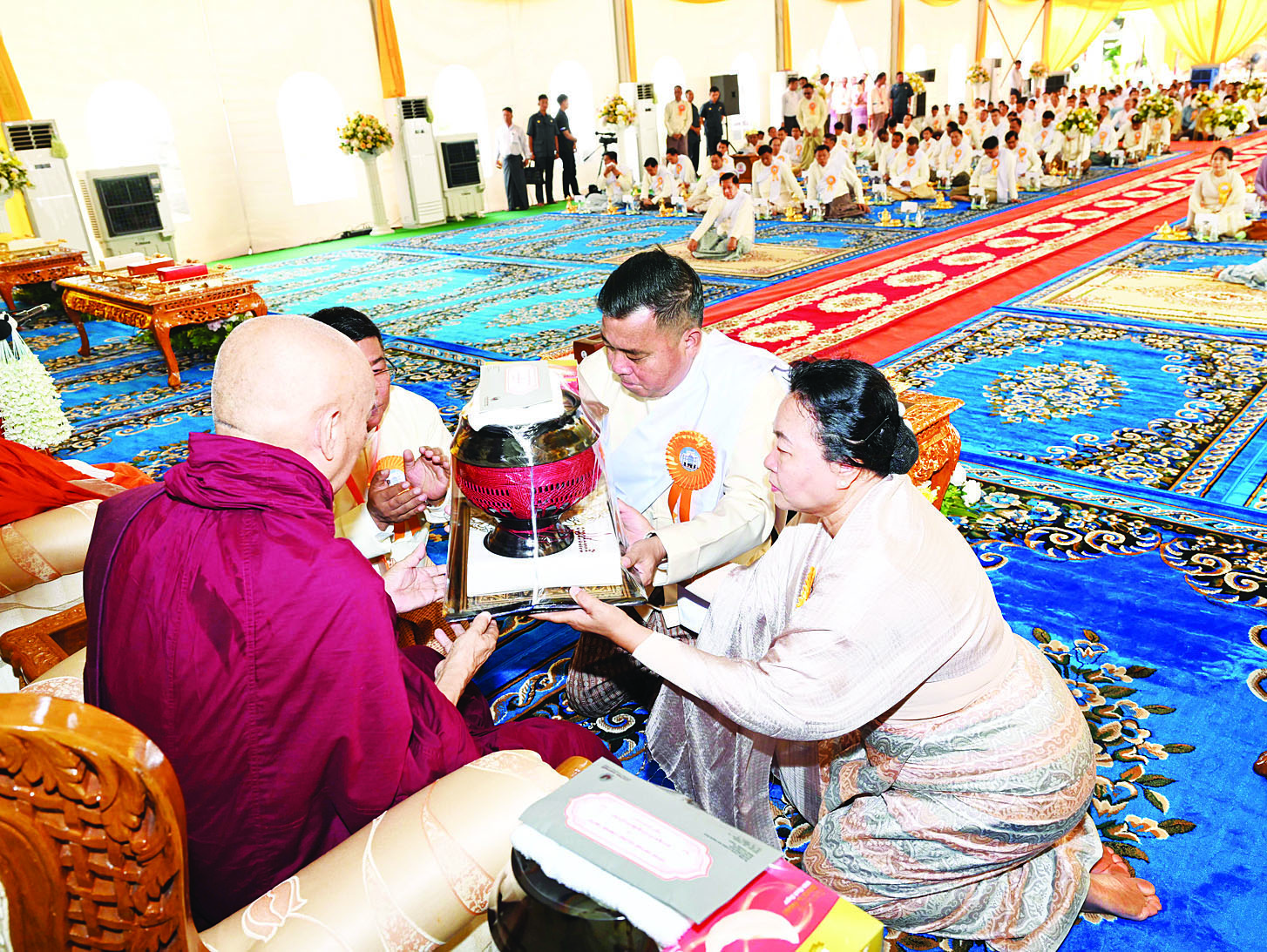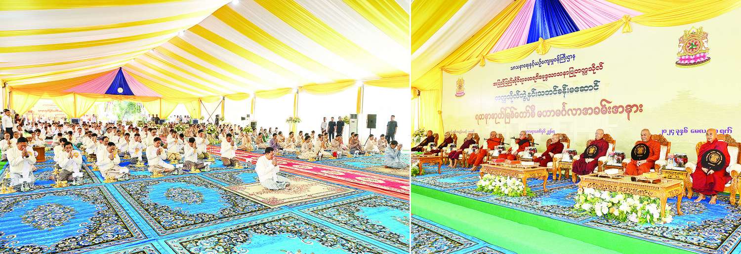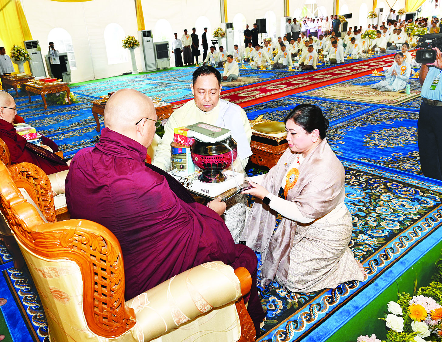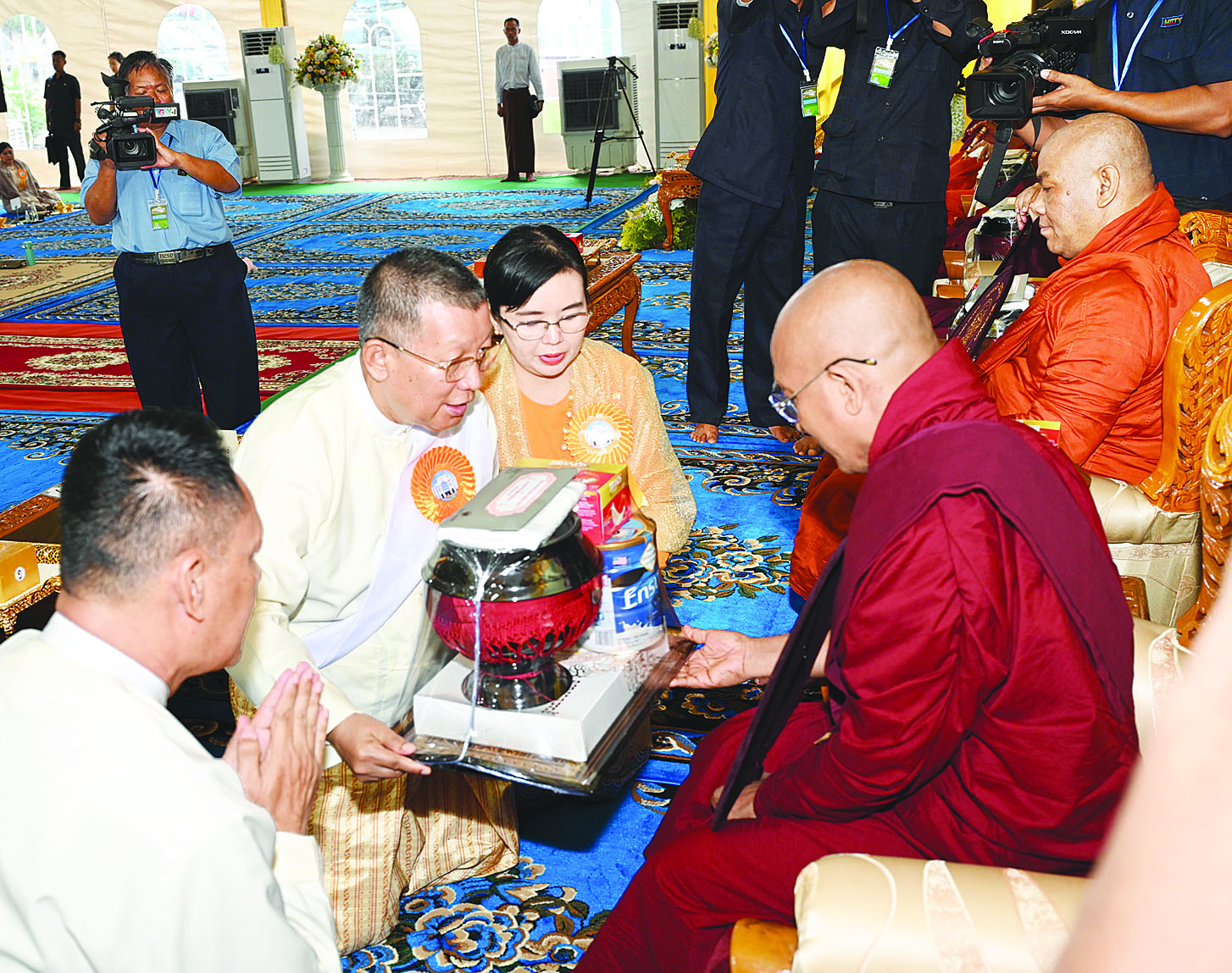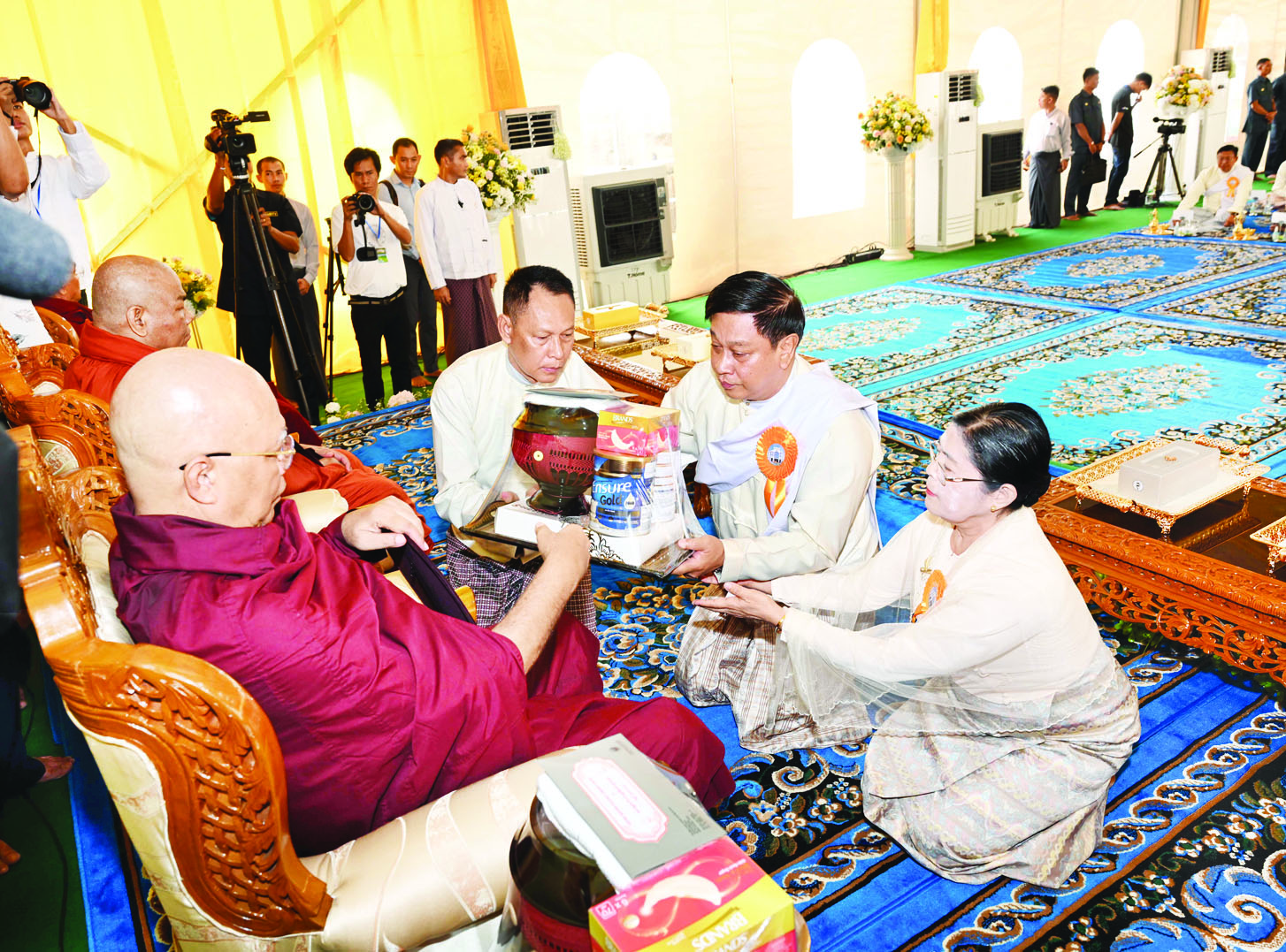 ယင်းနောက် နိုင်ငံတော်စီမံအုပ်ချုပ်ရေးကောင်စီဥက္ကဋ္ဌ နိုင်ငံတော်ဝန်ကြီးချုပ်နှင့် ဇနီး အခမ်းအနားတက်ရောက်လာကြသူများက ဆရာတော်ကြီးများကို နေ့ဆွမ်းဆက် ကပ်လှူဒါန်းခဲ့ကြသည်။