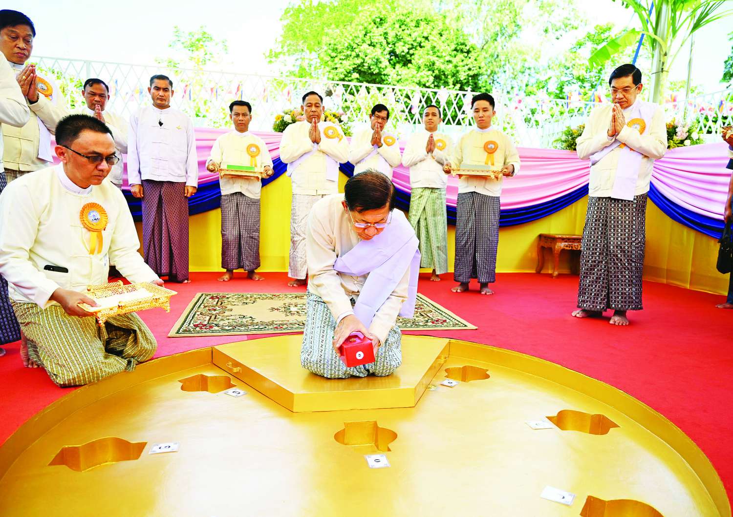 ထို့နောက် ဦးဆောင်အလှူဒါယိကာ နိုင်ငံတော်စီမံအုပ်ချုပ်ရေးကောင်စီဥက္ကဋ္ဌ နိုင်ငံတော်ဝန်ကြီးချုပ်က ခန်းမဆောင်အလယ်ဗဟိုချက်တည့်တည့်ရှိ ပတ္တမြား ရတနာအုတ်မြစ်တော်အား မြေသရွတ်တော်ဖြင့် အခိုင်အခန့်ပြုလုပ်ကာ ပရိတ်နံ့သာရည်များ ပတ်ဖျန်းပေးသည်။ ယင်းနောက် ကြွရောက်တော်မူကြသည့် ဆရာတော်၊ သံဃာတော်များ၊ ဦးဆောင်အလှူဒါယိကာ နိုင်ငံတော်စီမံအုပ်ချုပ်ရေးကောင်စီဥက္ကဋ္ဌ နိုင်ငံတော်ဝန်ကြီးချုပ်နှင့် ဇနီး အမှူးပြုသည့် ဧည့်ပရိတ်သတ်များက “ဇယန္တော ဗောဓိယာမူလေ” အစချီနှစ်ဂါထာကို ရွတ်ဆိုပူဇော်ကြပြီး ရတနာအုတ်မြစ်တော်စီအခမ်းအနားကို “ဗုဒ္ဓသာသနံ စိရံတိဋ္ဌတု” သုံးကြိမ်ရွတ်ဆိုဆုတောင်း၍ အခမ်းအနားကို ရုပ်သိမ်းလိုက်သည်။