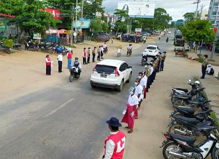ထိုသို့ဆောင်ရွက်ရာတွင် ခရိုင်/မြို့နယ် ကြက်ခြေနီတပ်ဖွဲ့ဝင်များနှင့် ချမ်းသာကြီး ပရဟိတ လူမှုကူညီရေးအသင်းတို့ ပူးပေါင်း၍ ကိုဗစ်-၁၉ ရောဂါ ကြိုတင် ကာကွယ်ရေး၊ ကူးစက်ပျံ့နှံ့မှုမဖြစ်ပွားစေရေးတို့အတွက် သတ်မှတ်စည်းကမ်းချက် များကို လိုက်နာဆောင် ရွက်နိုင်စေရန် လူသွားလူလာများသောနေရာများ၌ နှားခေါင်း စည်း Maskများကို အခမဲ့ဖြန့်ဝေပေးခြင်းနှင့် အသိပညာပေးနှိုးဆော်ခြင်းများကို ဆောင်ရွက်ခဲ့ကြောင်း သိရသည်။