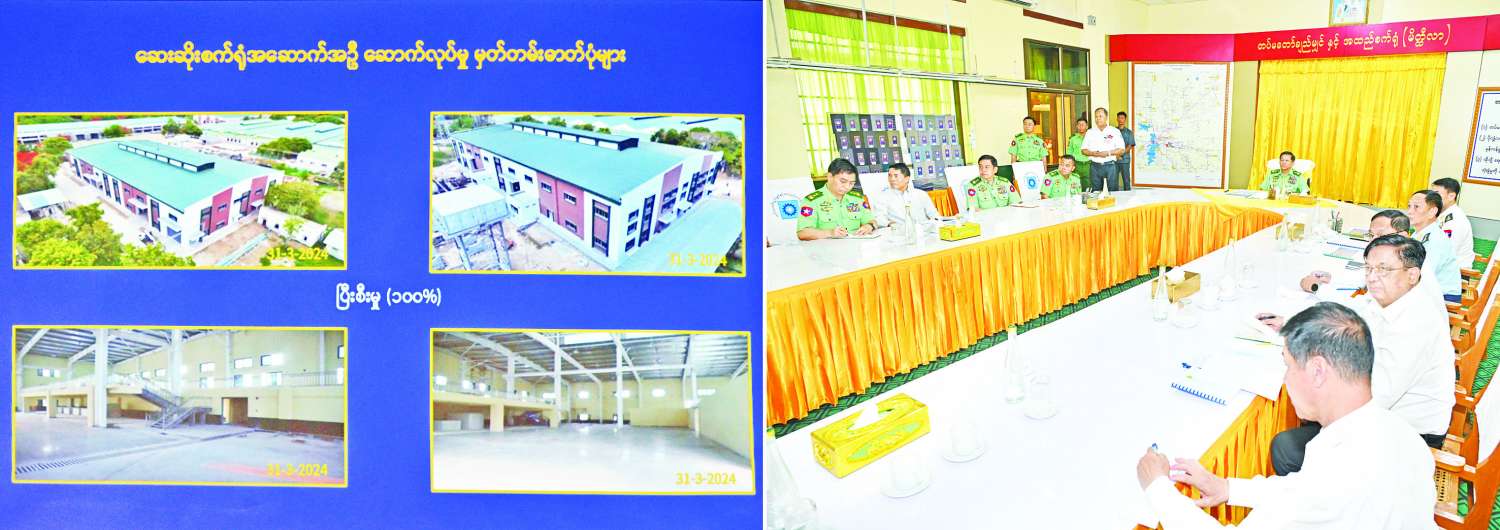 ထို့နောက် နိုင်ငံတော်စီမံအုပ်ချုပ်ရေးကောင်စီဥက္ကဋ္ဌ တပ်မတော်ကာကွယ်ရေးဦးစီးချုပ်နှင့် အဖွဲ့ဝင်များသည် အရည်အသွေးမြင့်ချည်များ ထုတ်လုပ်နိုင်မည့် ချည်ငင်စက်ရုံနှင့် ဆေးဆိုးစက်ရုံ တည်ဆောက်ရေးလုပ်ငန်းခွင်သို့ ရောက်ရှိကြပြီး စက်ရုံများ တည်ဆောက်ပြီးစီးမှုနှင့် စက်ကိရိယာများ တပ်ဆင်ပြီးစီးမှုအခြေအနေများကို ကြည့်ရှုစစ်ဆေးကာ စက်ရုံမှူးနှင့် စက်ရုံတည်ဆောက်ရေးတွင် ပါဝင်သည့် နိုင်ငံခြားသားပညာရှင်များ၏ တင်ပြချက်များအပေါ် လိုအပ်သည်များ ညှိနှိုင်းဖြည့်ဆည်းဆောင်ရွက်ပေးသည်။