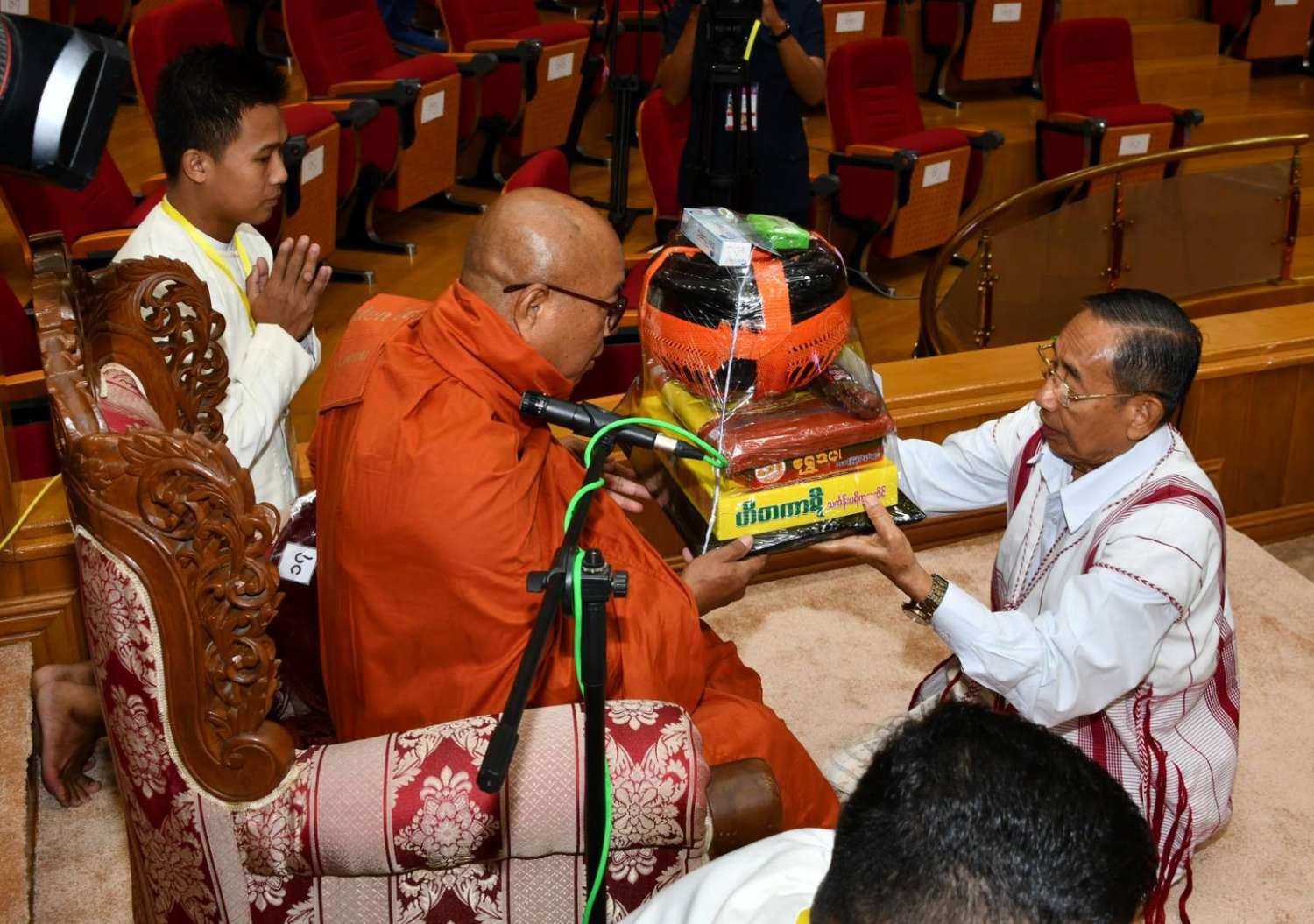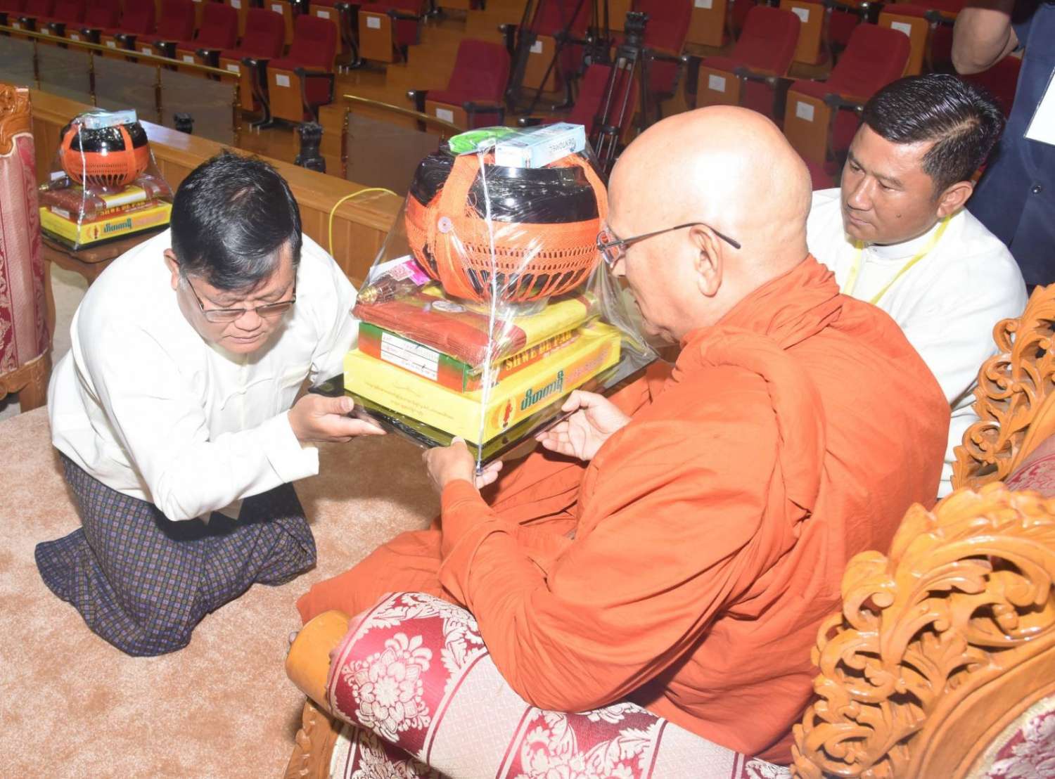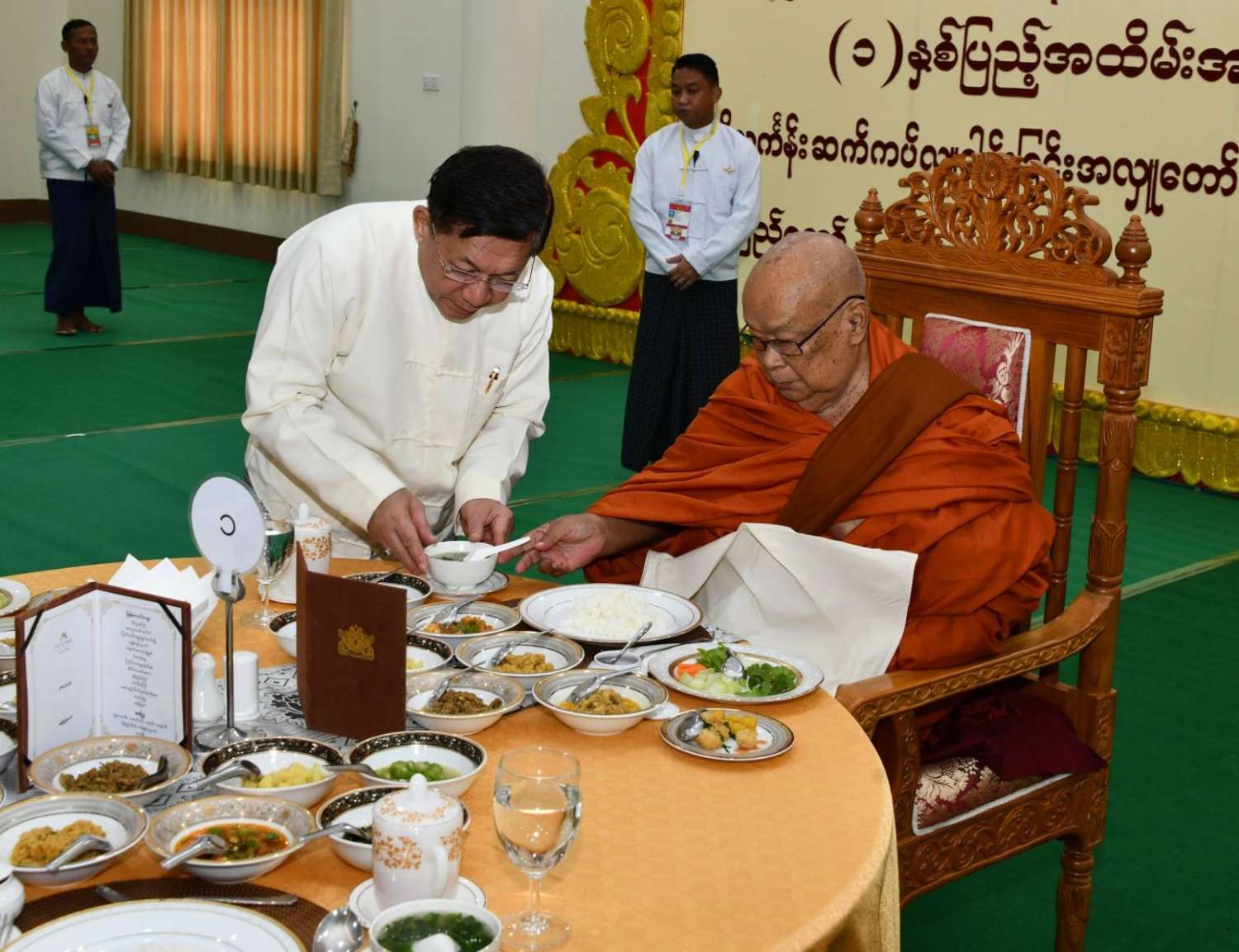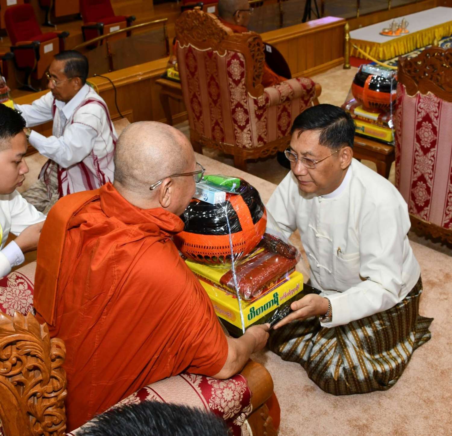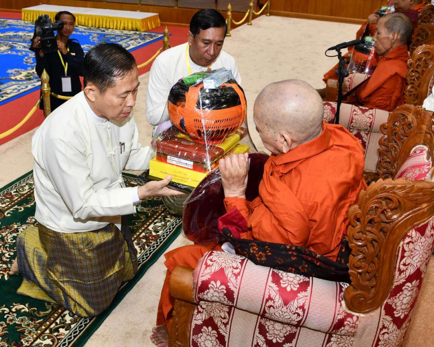 အဆိုပါအခမ်းအနားသို့ နေပြည်တော်၊ လယ်ဝေးမြို့၊ ပေါက်မြိုင်ကျောင်းတိုက် ပဓာနနာယက အဘိဓဇမဟာရဋ္ဌဂုရု ဘဒ္ဒန္တ ဇနိန္ဒ၊ နိုင်ငံတော်သြဝါဒါစရိယ၊ တပ်ကုန်းမြို့၊ မဟာသီဟနာဒကျောင်းတိုက်ဆရာတော် အဘိဓဇ မဟာရဋ္ဌဂုရု ဘဒ္ဒန္တ အာစိဏ္ဏတို့အမှူးပြုသော ဆရာတော်ကြီးများ ကြွရောက်ချီးမြှင့်တော်မူကြပြီး နိုင်ငံတော်စီမံအုပ်ချုပ်ရေးကောင်စီဥက္ကဋ္ဌ နိုင်ငံတော်ဝန်ကြီးချုပ်၊ နိုင်ငံတော်စီမံအုပ်ချုပ်ရေးကောင်စီဒုတိယဥက္ကဋ္ဌ ဒုတိယဝန်ကြီးချုပ် ဒုတိယဗိုလ်ချုပ်မှူးကြီး စိုးဝင်း၊ ကောင်စီအတွင်းရေးမှူး၊ တွဲဖက်အတွင်းရေးမှူး၊ ကောင်စီဝင်များ၊ ပြည်ထောင်စုအဆင့်ပုဂ္ဂိုလ်များ၊ ပြည်ထောင်စုဝန်ကြီးများ၊ နေပြည်တော်ကောင်စီဥက္ကဋ္ဌ၊ ကာကွယ်ရေးဦးစီးချုပ်ရုံးမှ အဆင့်မြင့်တပ်မတော်အရာရှိကြီးများ၊ နေပြည်တော်တိုင်းစစ်ဌာနချုပ်တိုင်းမှူးနှင့် တာဝန်ရှိသူများ တက်ရောက်ကြသည်။
