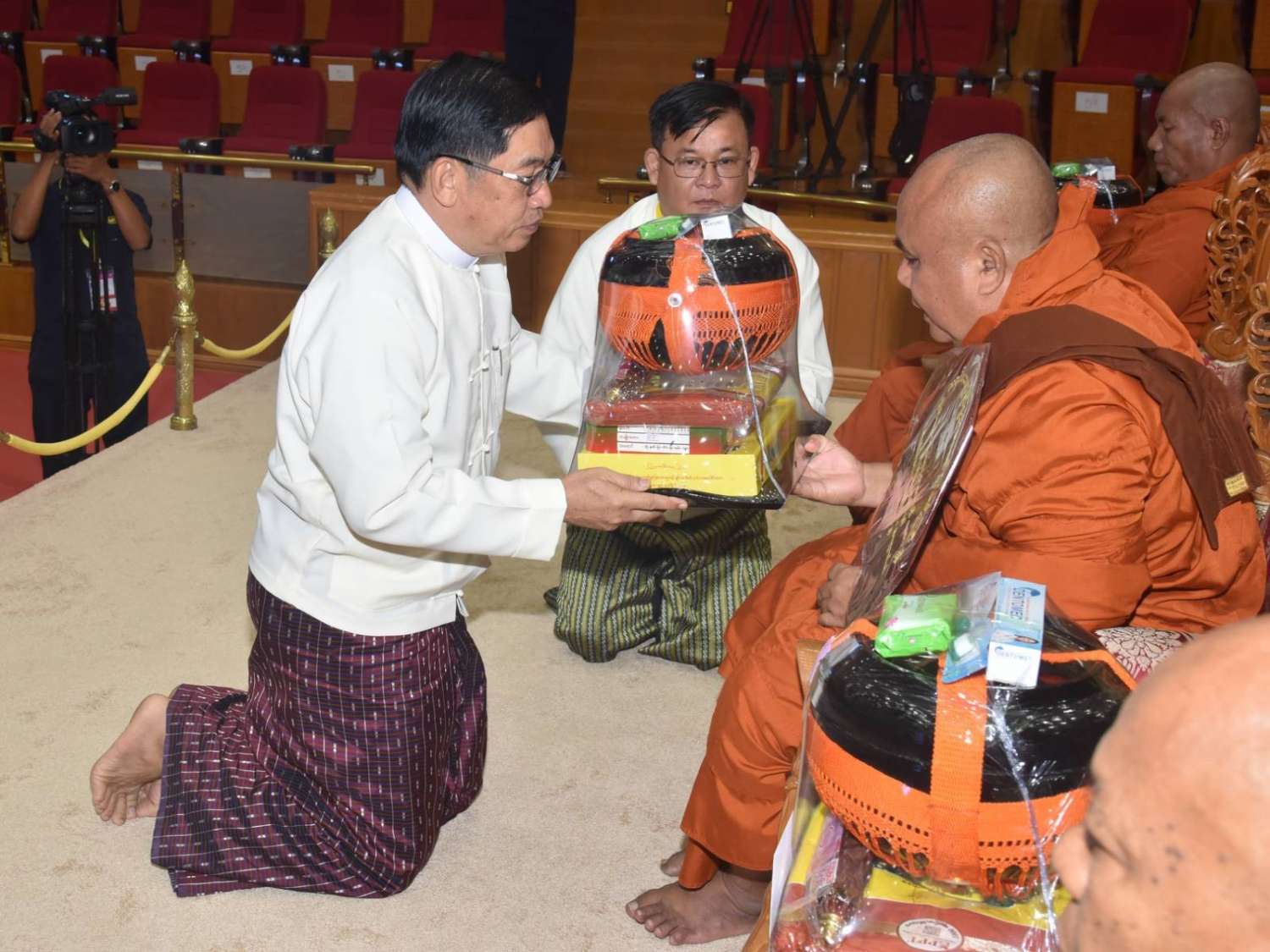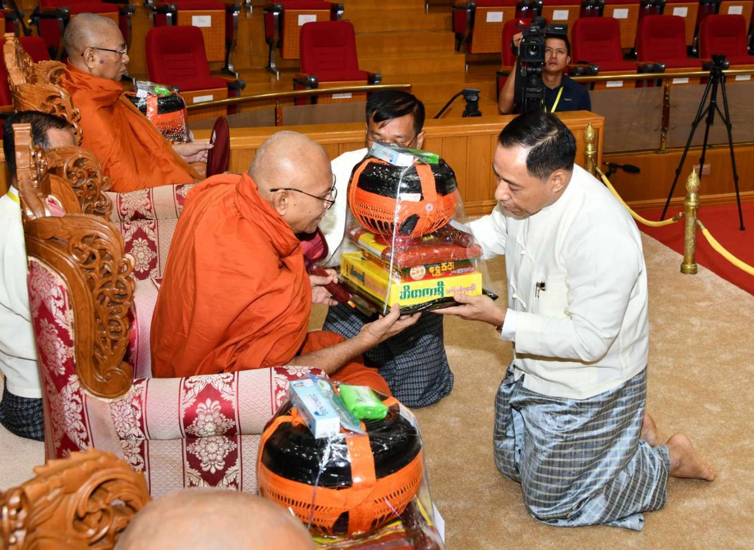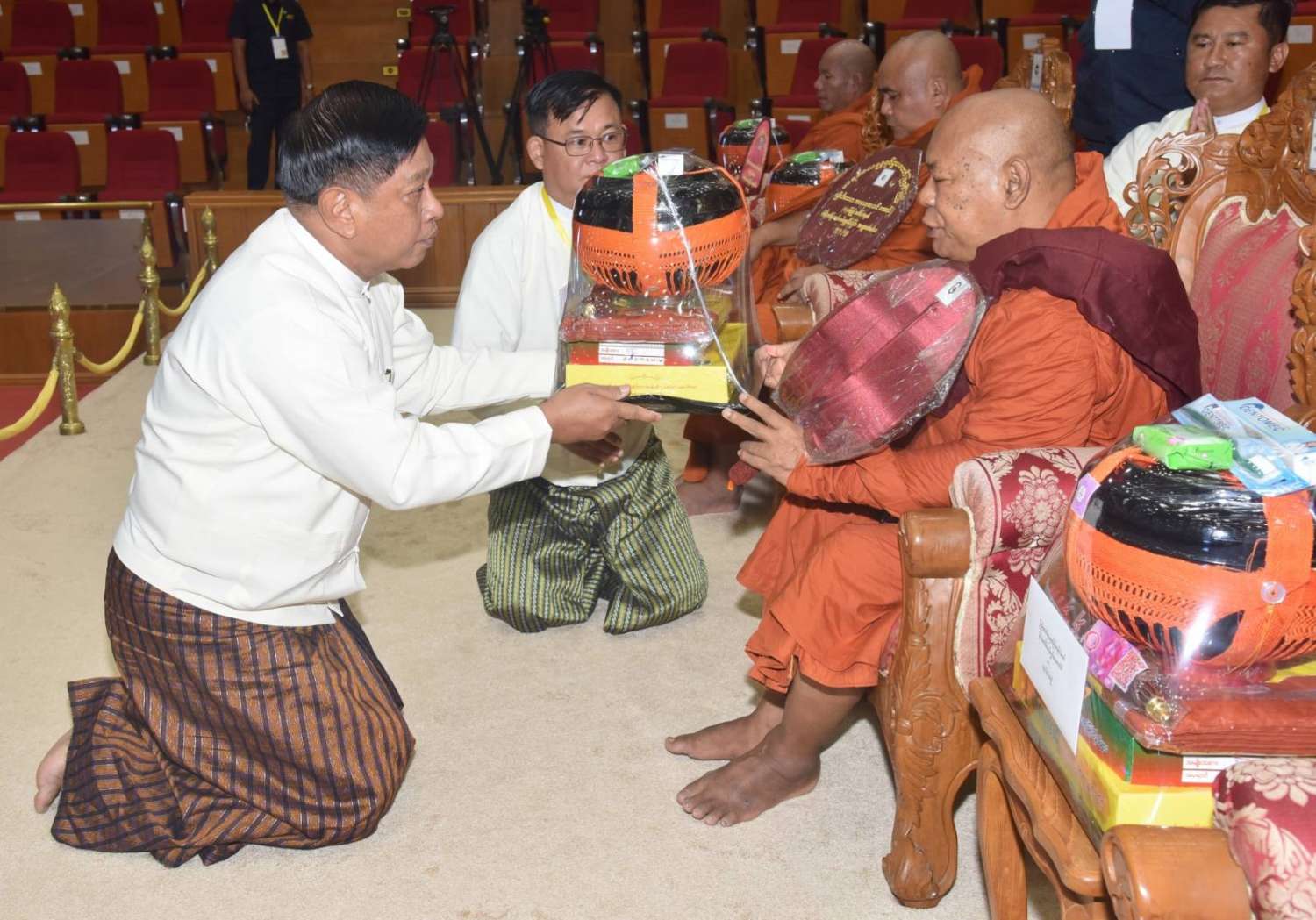 ယင်းနောက် နိုင်ငံတော်စီမံအုပ်ချုပ်ရေးကောင်စီဒုတိယဥက္ကဋ္ဌ ဒုတိယဝန်ကြီးချုပ်က မဟာသီဟနာဒကျောင်းတိုက် ဆရာတော်ကြီးထံ ဝါဆိုသင်္ကန်းနှင့် လှူဖွယ်ပစ္စည်းများကို ဆက်ကပ်လှူဒါန်းသည်။ ဆက်လက်၍ ကောင်စီအတွင်းရေးမှူး၊ တွဲဖက်အတွင်းရေးမှူး၊ ကောင်စီဝင်များ၊ ပြည်ထောင်စုအဆင့်ပုဂ္ဂိုလ်များက ဆရာတော်၊ သံဃာတော်များထံ ဝါဆိုသင်္ကန်းနှင့် လှူဖွယ်ပစ္စည်းများကို အသီးသီးဆက်ကပ်လှူဒါန်းကြသည်။