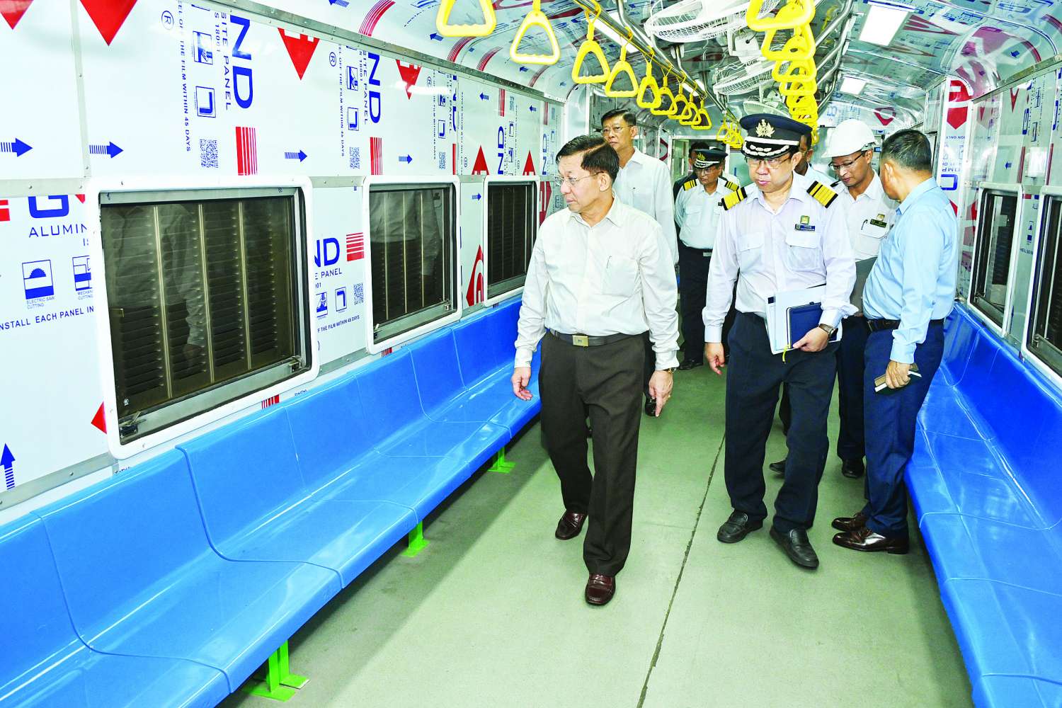 ထို့နောက် နိုင်ငံတော်စီမံအုပ်ချုပ်ရေးကောင်စီဥက္ကဋ္ဌ နိုင်ငံတော်ဝန်ကြီးချုပ်နှင့် အဖွဲ့ဝင်များသည် စက်ခေါင်းသစ်တပ်ဆင်ထုတ်လုပ်ရေးစက်ရုံ(နေပြည်တော်)အတွင်း ဂျပန်နိုင်ငံမှ ဝယ်ယူထားရှိသည့် ရန်ကုန်-မန္တလေးလမ်းပိုင်းတွင် ပြေးဆွဲမည့် DEMU တွဲဆိုင်းများနှင့် မြန်မာနိုင်ငံမှတည်ဆောက်ထားသည့် DEMU ရထားတွဲတို့အား လှည့်လည်ကြည့်ရှုစစ်ဆေးရာ တာဝန်ရှိသူများက လိုက်လံရှင်းလင်းတင်ပြမှုများအပေါ် နိုင်ငံတော်စီမံအုပ်ချုပ်ရေးကောင်စီဥက္ကဋ္ဌ နိုင်ငံတော်ဝန်ကြီးချုပ်က လိုအပ်သည်များလမ်းညွှန်မှာကြားသည်။