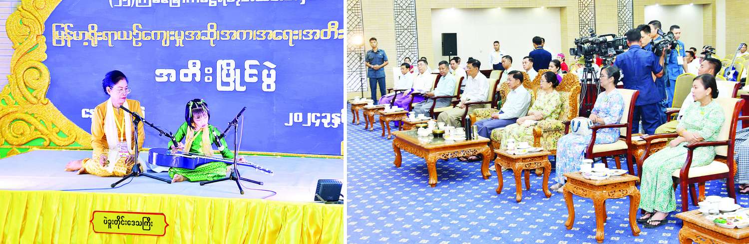 ထို့နောက် နိုင်ငံတော်စီမံအုပ်ချုပ်ရေးကောင်စီဥက္ကဋ္ဌ နိုင်ငံတော်ဝန်ကြီးချုပ်နှင့်ဇနီး နှင့်အဖွဲ့ဝင်များသည် မြန်မာအပြည်ပြည်ဆိုင်ရာကွန်ဗင်းရှင်းဗဟိုဌာန (၂) News Briefing Room ၌ကျင်းပသည့် အခြေခံပညာအဆင့် အသက် ၁၀ နှစ်မှ ၁၅ နှစ်အတွင်း (အမျိုးသမီး) (ဂီတာ) အတီးပြိုင်ပွဲတွင် ပြိုင်ပွဲဝင်များက “ဝေဘာဂီရိ” (ကြိုး) သီချင်းအား သီချင်း၏ရသပေါ်လွင်စေပြီး နားဆင်သူများ နားဝင်ပီယံရှိစေရန် လက်စွမ်းပြတီးခတ်ယှဉ်ပြိုင်နေမှုကို ကြည့်ရှုအားပေးကြသည်။