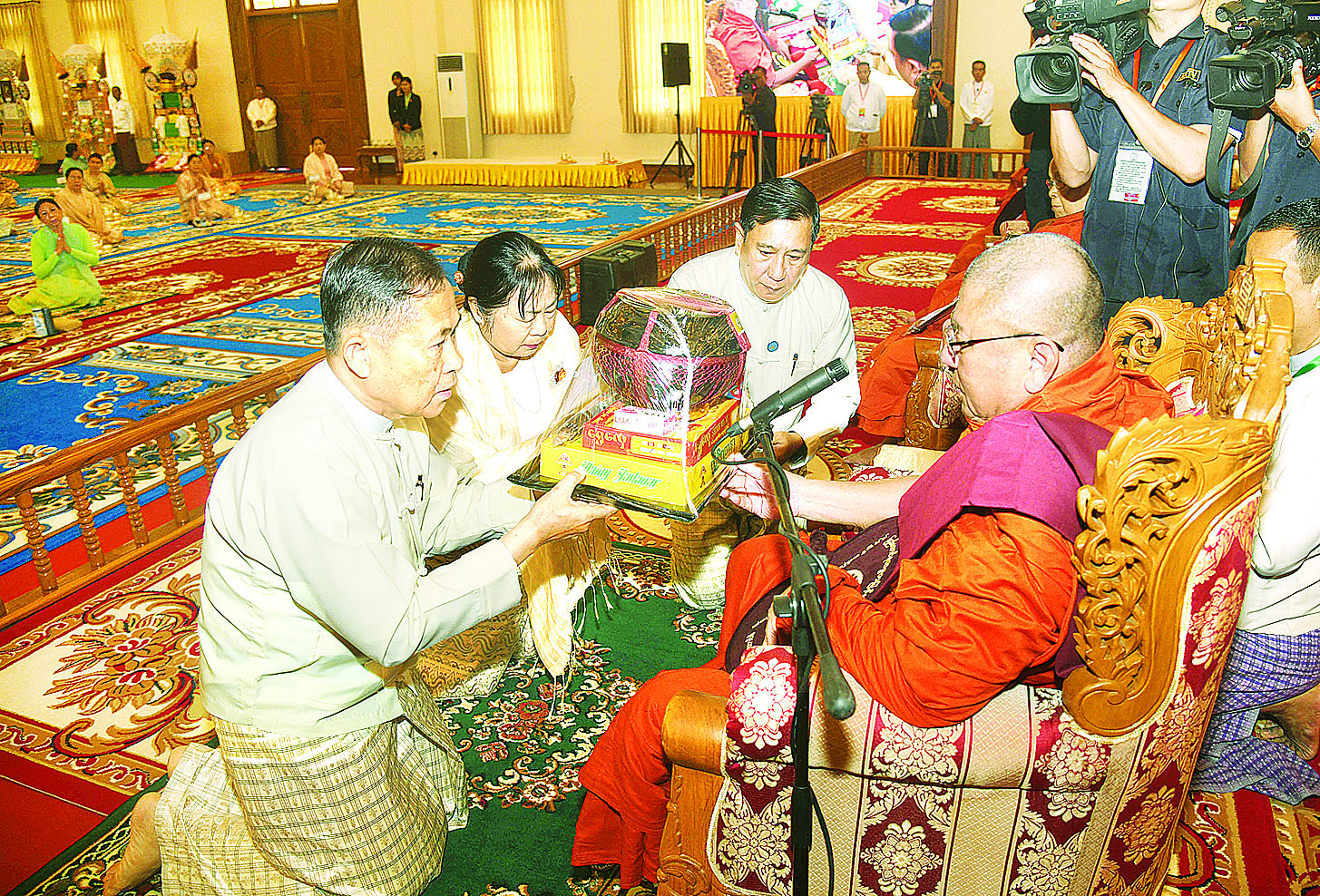 ဦးစွာ နိုင်ငံတော်စီမံအုပ်ချုပ်ရေးကောင်စီဥက္ကဋ္ဌ နိုင်ငံတော်ဝန်ကြီးချုပ်သည် သာသနာ့မဟာဗိမာန်တော်အတွင်းရှိ ဗုဒ္ဓရုပ်ပွားတော်မြတ်အား ဖူးမြော်ကြည်ညို၍ မြသပိတ်ဆွမ်းတော်၊ ပန်း၊ ရေချမ်း၊ ဆီမီးနှင့် သစ်သီးတို့ကို ဆက်ကပ်လှူဒါန်းသည်။