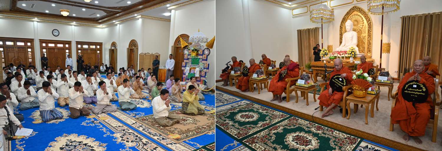 ဦးစွာ နိုင်ငံတော်စီမံအုပ်ချုပ်ရေးကောင်စီဥက္ကဋ္ဌ နိုင်ငံတော်ဝန်ကြီးချုပ်က မာရဝိဇယ ကျောင်းဆောင်တော်အတွင်းရှိ ဗုဒ္ဓရုပ်ပွားတော်မြတ်အား မြသပိတ်ဆွမ်းတော်၊ သစ်သီးနှင့် ပန်းမန်၊ သောက်တော်ရေချမ်းများ ကပ်လှူပူဇော်သည်။