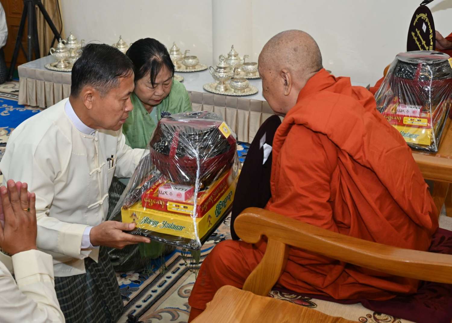 ဆက်လက်ပြီး ကောင်စီအတွင်းရေးမှူးနှင့်ဇနီး၊ တွဲဖက်အတွင်းရေးမှူးနှင့်ဇနီး၊ ကောင်စီဝင်များ၊ ပြည်ထောင်စုဝန်ကြီးများက ဆရာတော်၊ သံဃာတော်များထံ ကထိန်သင်္ကန်းနှင့် လှူဖွယ်ပစ္စည်းများကို အသီးသီးဆက်ကပ်လှူဒါန်းကြသည်။