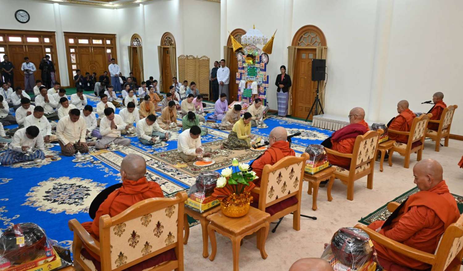 အခမ်းအနားသို့ လယ်ဝေးမြို့၊ ပေါက်မြိုင်ကျောင်းတိုက် ပဓာနနာယက အဘိဓဇ မဟာရဋ္ဌဂုရု ဘဒ္ဒန္တဇနိန္ဒ အမှူးပြုသည့် ဆရာတော်ကြီးများနှင့် မာရဝိဇယကျောင်းတော်တွင် သီတင်းသုံးတော်မူကြသည့် ဆရာတော်ကြီးများ ကြွရောက်ချီးမြှင့်တော်မူကြပြီး နိုင်ငံတော်စီမံအုပ်ချုပ်ရေးကောင်စီဥက္ကဋ္ဌ နိုင်ငံတော်ဝန်ကြီးချုပ် ဗိုလ်ချုပ်မှူးကြီး မင်းအောင်လှိုင်နှင့်ဇနီး ဒေါ်ကြူကြူလှတို့နှင့်အတူ နိုင်ငံတော်စီမံအုပ်ချုပ်ရေးကောင်စီ ဒုတိယဥက္ကဋ္ဌ၊ ဒုတိယဝန်ကြီးချုပ် ဒုတိယဗိုလ်ချုပ်မှူးကြီး စိုးဝင်းနှင့်ဇနီး ဒေါ်သန်းသန်းနွယ်၊ ကောင်စီအတွင်းရေးမှူးနှင့်ဇနီး၊ တွဲဖက်အတွင်းရေးမှူးနှင့်ဇနီး၊ ကောင်စီဝင်များနှင့်ဇနီးများ၊ ပြည်ထောင်စုဝန်ကြီးများနှင့် ဇနီးများ၊ နေပြည်တော်ကောင်စီဥက္ကဋ္ဌ၊ ကာကွယ်ရေးဦးစီးချုပ်ရုံးမှ အဆင့်မြင့်တပ်မတော်အရာရှိကြီးများနှင့်ဇနီးများ၊ နေပြည်တော်တိုင်းစစ်ဌာနချုပ်တိုင်းမှူးနှင့် တာဝန်ရှိသူများ တက်ရောက်ကြသည်။