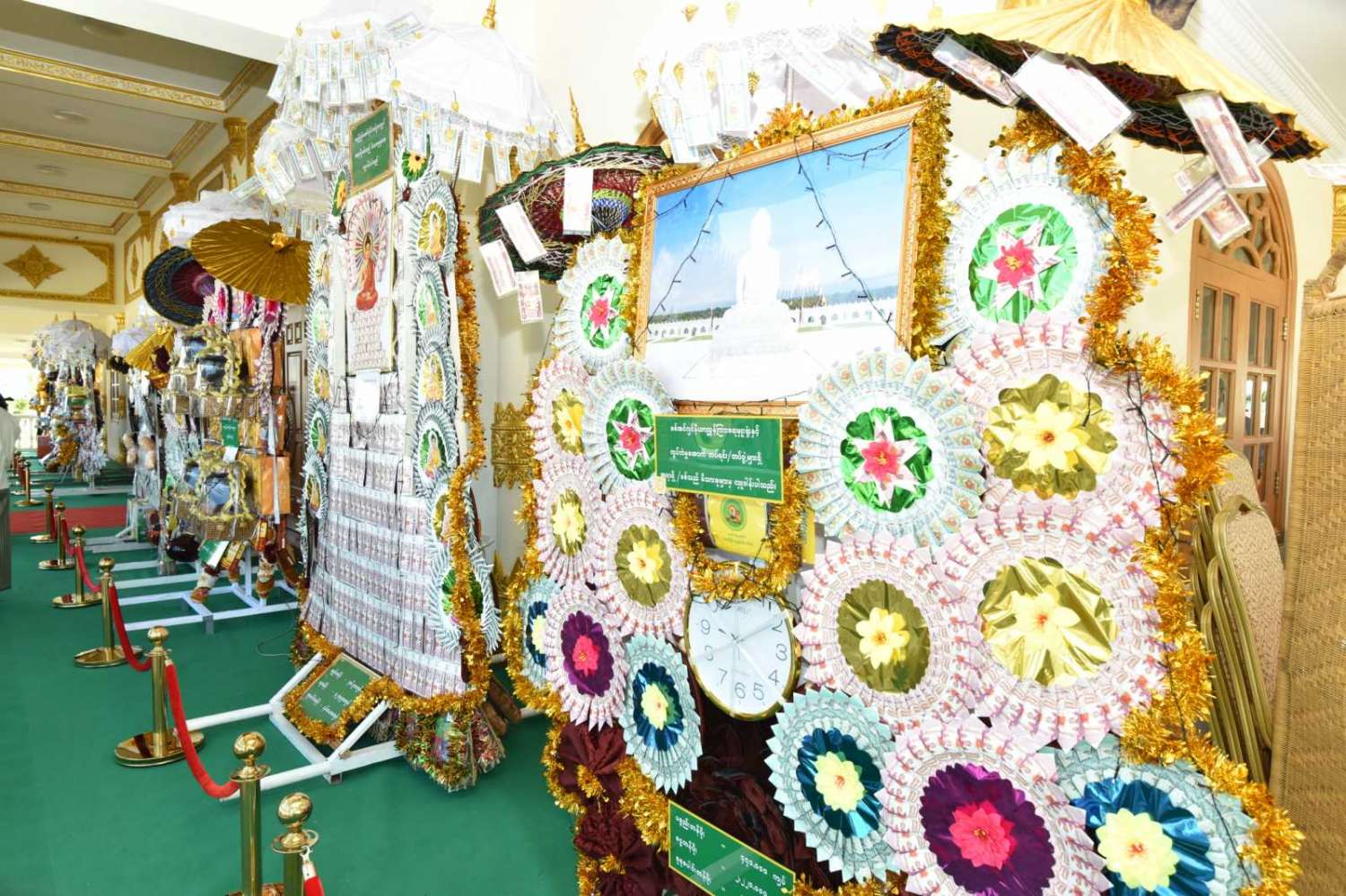 ယင်းနောက် အခမ်းအနားကို “ဗုဒ္ဓသာသနံ စိရံ တိဋ္ဌတု” သုံးကြိမ်ရွတ်ဆိုဆုတောင်း၍ အခမ်းအနားကို ရုပ်သိမ်းလိုက်ပြီး အခမ်းအနားအောင်မြင်ခြင်းအထိမ်းအမှတ် နိုင်ငံတော်စီမံအုပ်ချုပ်ရေးကောင်စီဥက္ကဋ္ဌ နိုင်ငံတော်ဝန်ကြီးချုပ်နှင့်ဇနီးတို့က ရတနာရွှေမိုးငွေမိုးများ ရွာသွန်းဖြိုးကြသည်။ အခမ်းအနားအပြီးတွင် ပေါက်မြိုင်ဆရာတော်ကြီး အမှူးပြုသည့် ဆရာတော်၊ သံဃာတော်များအား နိုင်ငံတော်စီမံအုပ်ချုပ်ရေးကောင်စီဥက္ကဋ္ဌ နိုင်ငံတော်ဝန်ကြီးချုပ်နှင့်ဇနီး၊ ဧည့်ပရိသတ်များက နေ့ဆွမ်းဆက်ကပ်လှူဒါန်းခဲ့ကြကြောင်း သတင်းရရှိသည်။