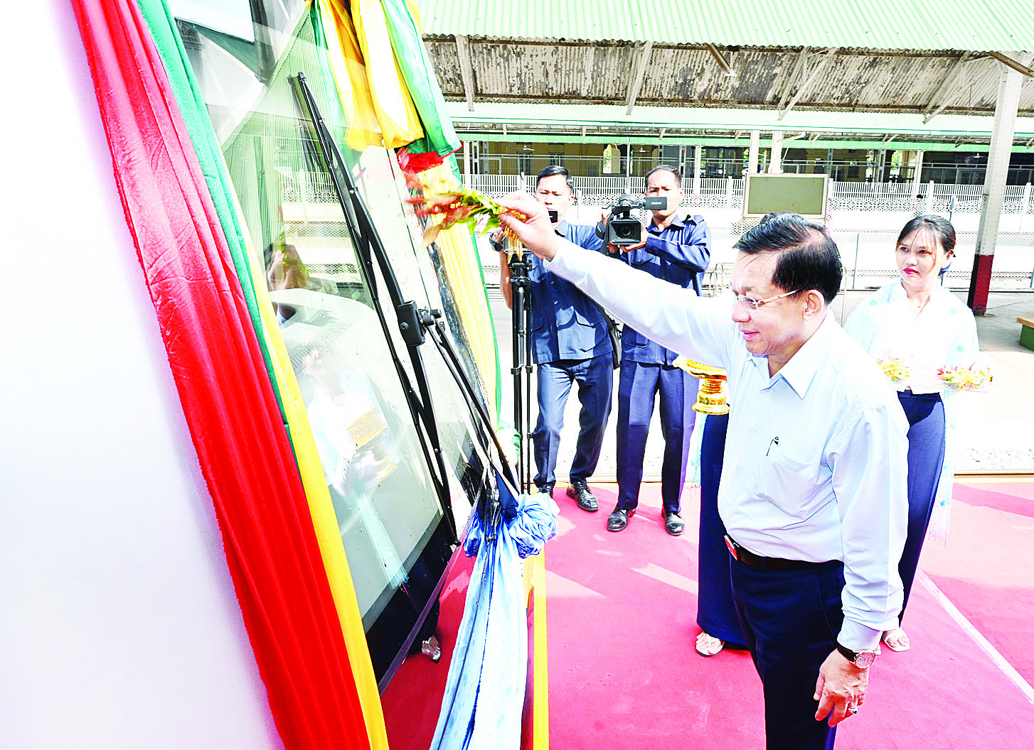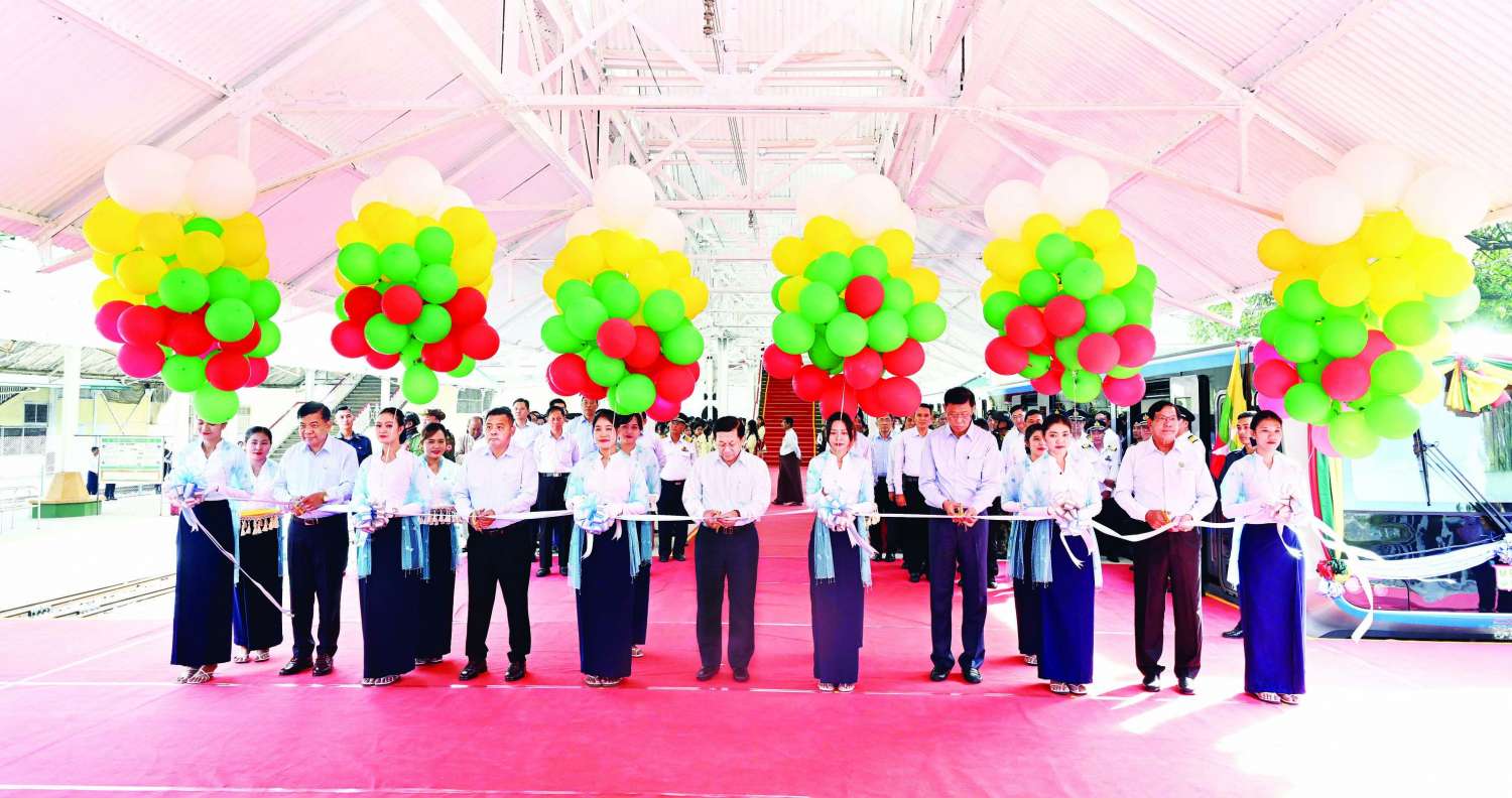 ရန်ကုန်မြို့ပတ်ရထားလမ်းပိုင်းတွင် ခေတ်မီ Diesel Electric Multiple Unit (DEMU) ရထားတွဲဆိုင်းအသစ်များဖြင့် စတင်ပြေးဆွဲခြင်း ဖွင့်ပွဲအခမ်းအနားကျင်းပ နိုင်ငံတော်စီမံအုပ်ချုပ်ရေးကောင်စီဥက္ကဋ္ဌ နိုင်ငံတော်ဝန်ကြီးချုပ် ဗိုလ်ချုပ်မှူးကြီး မင်းအောင်လှိုင် တက်ရောက်ဖွင့်လှစ်