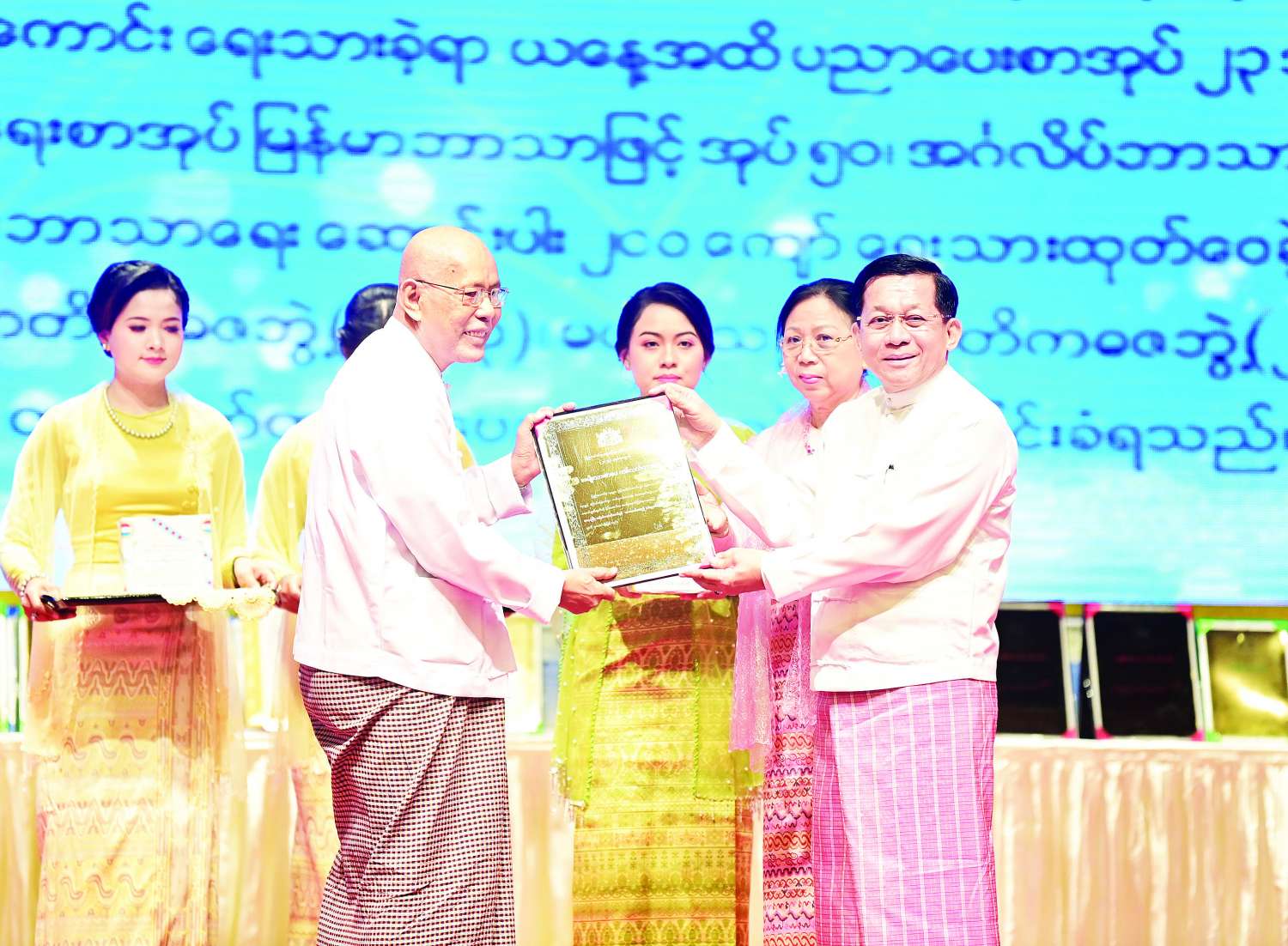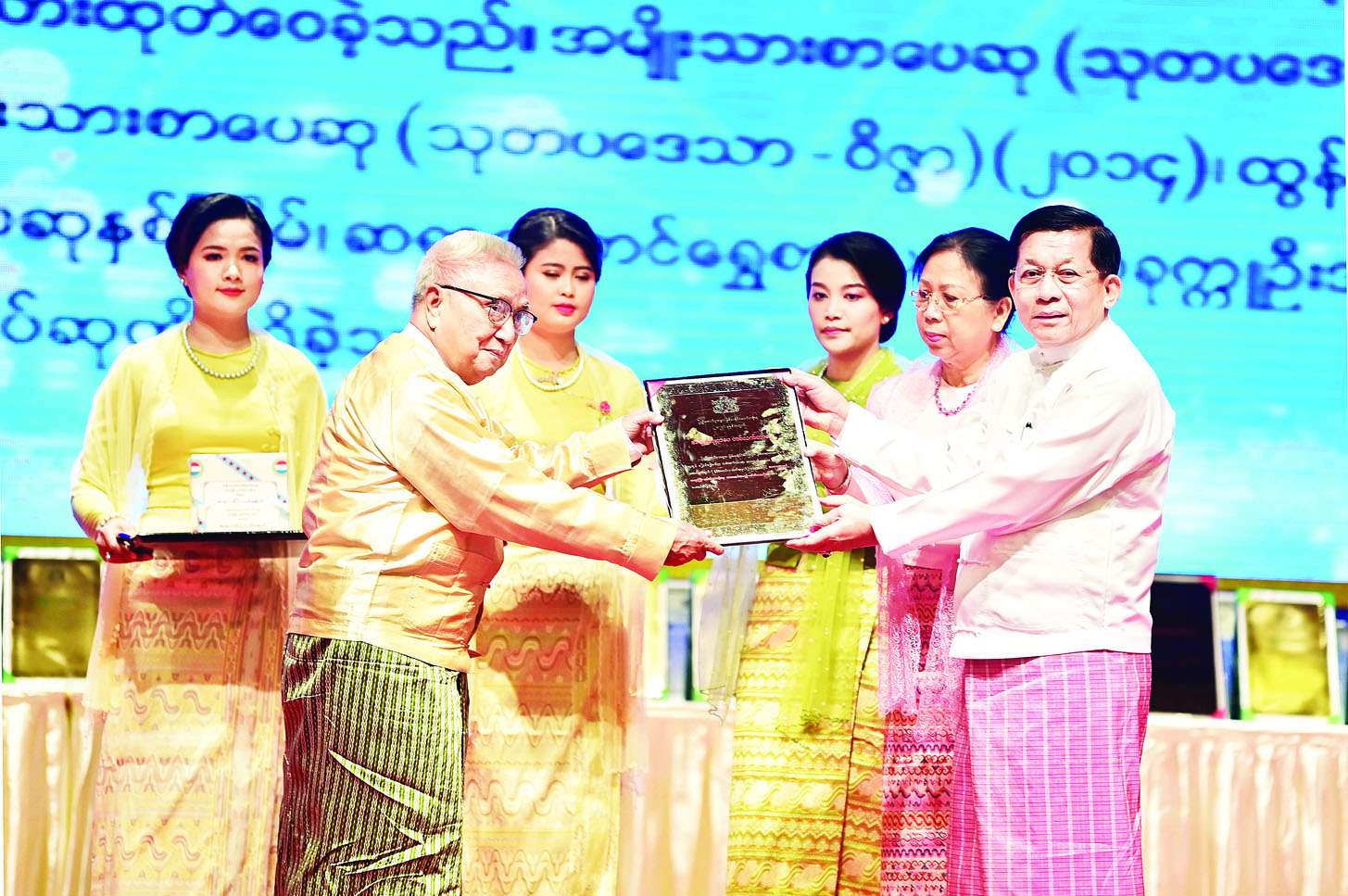 ယင်းနောက် နိုင်ငံတော်စီမံအုပ်ချုပ်ရေးကောင်စီဥက္ကဋ္ဌ နိုင်ငံတော်ဝန်ကြီးချုပ်နှင့် ဇနီးတို့က ၂၀၂၃ ခုနှစ်၊ အမျိုးသားစာပေတစ်သက်တာဆုရရှိကြသည့် စာပေပညာရှင်ဆရာကြီး ဒေါက်တာ မင်းတင်မွန်(ပါရဂူမင်းနန္ဒာ)၊ စာပေပညာရှင်ဆရာကြီး ဒေါက်တာ တိုးလှ၊ စာပေပညာရှင်ဆရာကြီး ဦးညွန့်ဆွေ(မောင်ဆွေသက်)၊ စာပေပညာရှင် ဆရာကြီး ဦးသန်းဆွေ (မောင်သန်းဆွေ-ထားဝယ်)၊ စာပေပညာရှင် ဆရာကြီး ဒေါက်တာကျော်ဝင်း(သမိုင်းပါမောက္ခ-ငြိမ်း)နှင့် စာပေပညာရှင်ဆရာကြီး ဦးညွန့်တင် (မောင်ငြိမ်းသူ-ကြို့ပင်ကောက်)တို့ကို ဆုတံဆိပ်များ၊ ဂုဏ်ပြုချီးမြှင့်ငွေနှင့် အမှတ်တရဂုဏ်ပြုလက်ဆောင်များ ပေးအပ်ချီးမြှင့်သည်။
