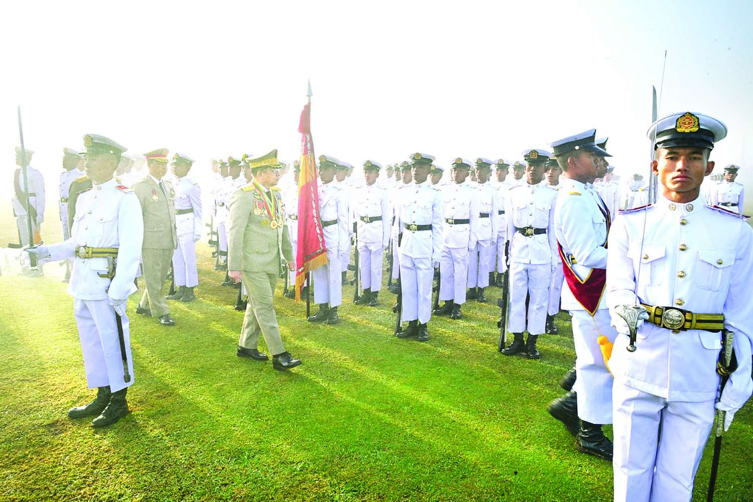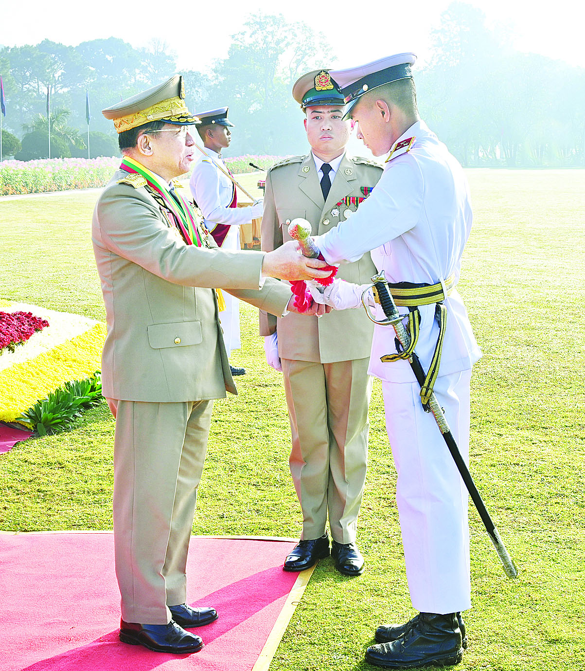 ယင်းနောက် နိုင်ငံတော်စီမံအုပ်ချုပ်ရေးကောင်စီဥက္ကဋ္ဌ တပ်မတော်ကာကွယ်ရေးဦးစီးချုပ် ဗိုလ်ချုပ်မှူးကြီး သတိုးမဟာသရေစည်သူ သတိုးသီရိသုဓမ္မ မင်းအောင်လှိုင်သည် ဗိုလ်လောင်းတပ်ခွဲများ၏ အလေးပြုခြင်းကို ခံယူပြီးနောက် စစ်ရေးပြအခမ်းအနားမှ ပြန်လည်ထွက်ခွာသည်။