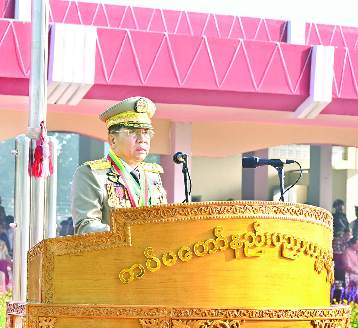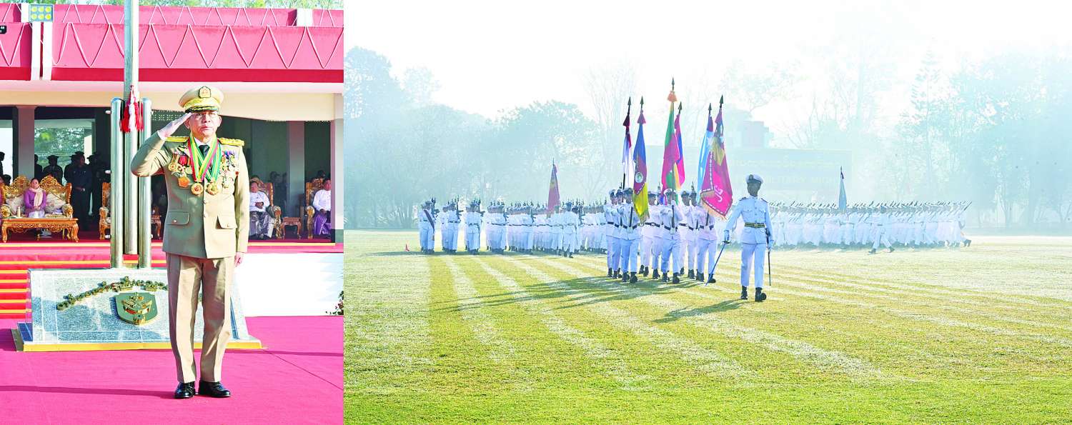 တပ်မတော်နည်းပညာတက္ကသိုလ် ဗိုလ်လောင်းသင်တန်းအမှတ်စဉ်(၂၆) သင်တန်းဆင်း ဂုဏ်ပြုစစ်ရေးပြအခမ်းအနားကို ယနေ့နံနက်ပိုင်းတွင် ပြင်ဦးလွင်မြို့၊ တပ်မတော်နည်းပညာတက္ကသိုလ် စစ်ရေးပြကွင်း၌ ကျင်းပပြုလုပ်ရာ နိုင်ငံတော်စီမံအုပ်ချုပ်ရေးကောင်စီဥက္ကဋ္ဌ တပ်မတော်ကာကွယ်ရေးဦးစီးချုပ် ဗိုလ်ချုပ်မှူးကြီး သတိုးမဟာသရေစည်သူ သတိုးသီရိသုဓမ္မ မင်းအောင်လှိုင် တက်ရောက်မိန့်ခွန်းပြောကြားသည်။