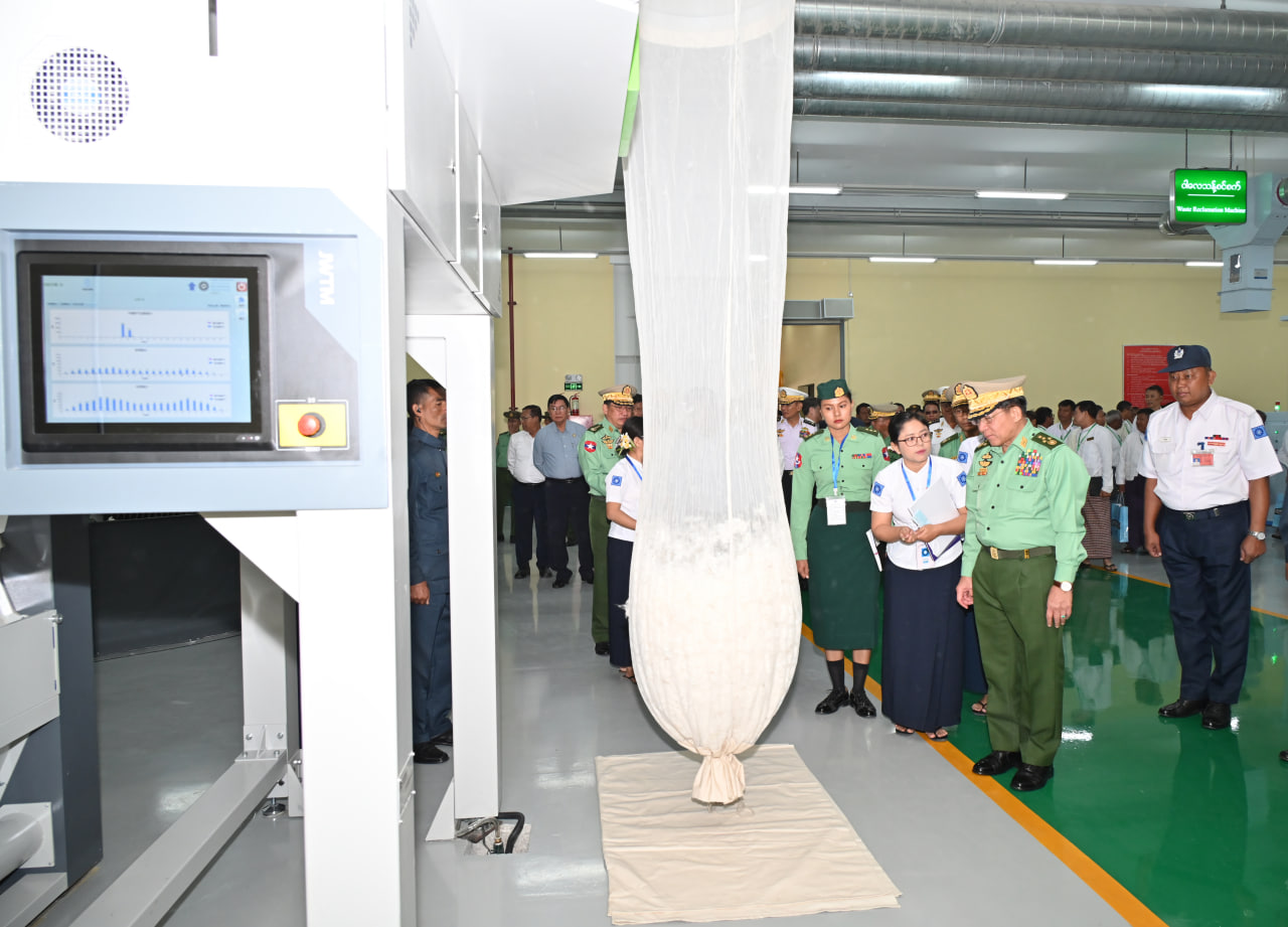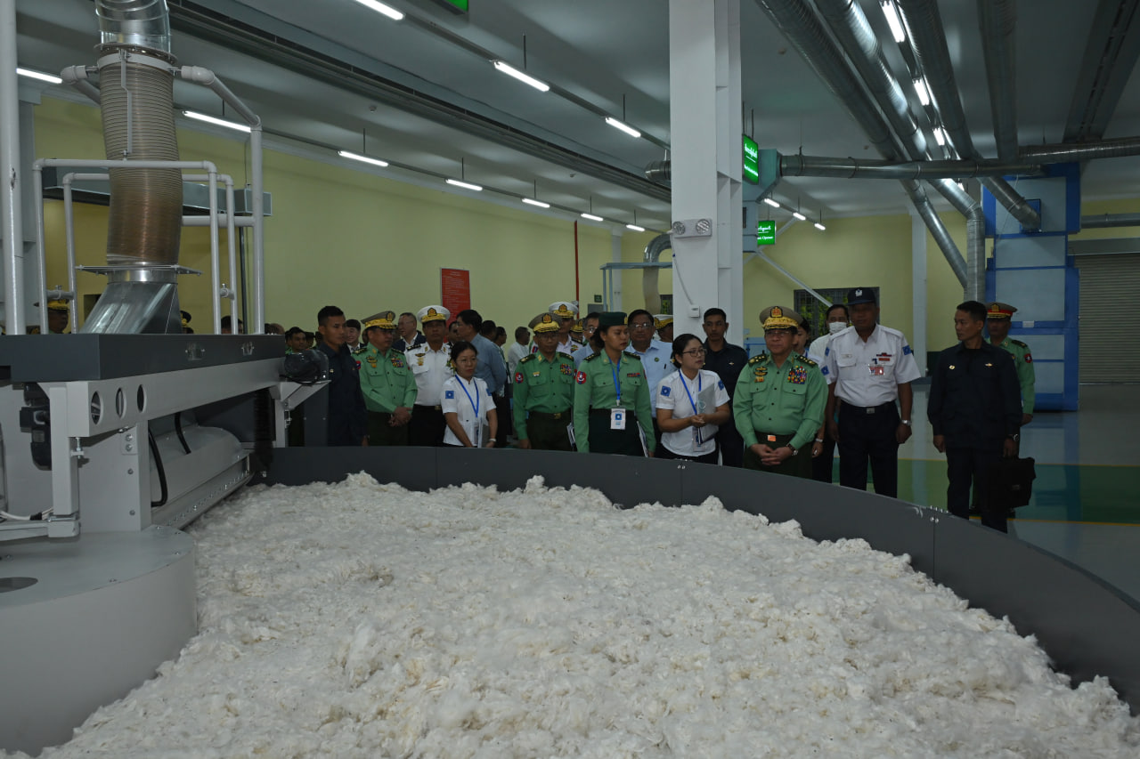 ၎င်းနောက် နိုင်ငံတော်စီမံအုပ်ချုပ်ရေးကောင်စီဥက္ကဋ္ဌ တပ်မတော်ကာကွယ်ရေးဦးစီးချုပ်နှင့် အဖွဲ့ဝင်များသည် ဝါစိုက်ပျိုးထုတ်လုပ်မှုနှင့် ချည်မျှင်ထုတ်လုပ်မှုအဆင့်ဆင့်ပြကွက်များနှင့် တပ်မတော်ချည်မျှင်နှင့်အထည်စက်ရုံ(မိတ္ထီလာ)၊ ၂/၈၀ ချည်ချော စက်ရုံခွဲမှ ထုတ်လုပ်ထားသည့် ချည်ထည်ပစ္စည်းများကို လှည့်လည်ကြည့်ရှုကြသည်။