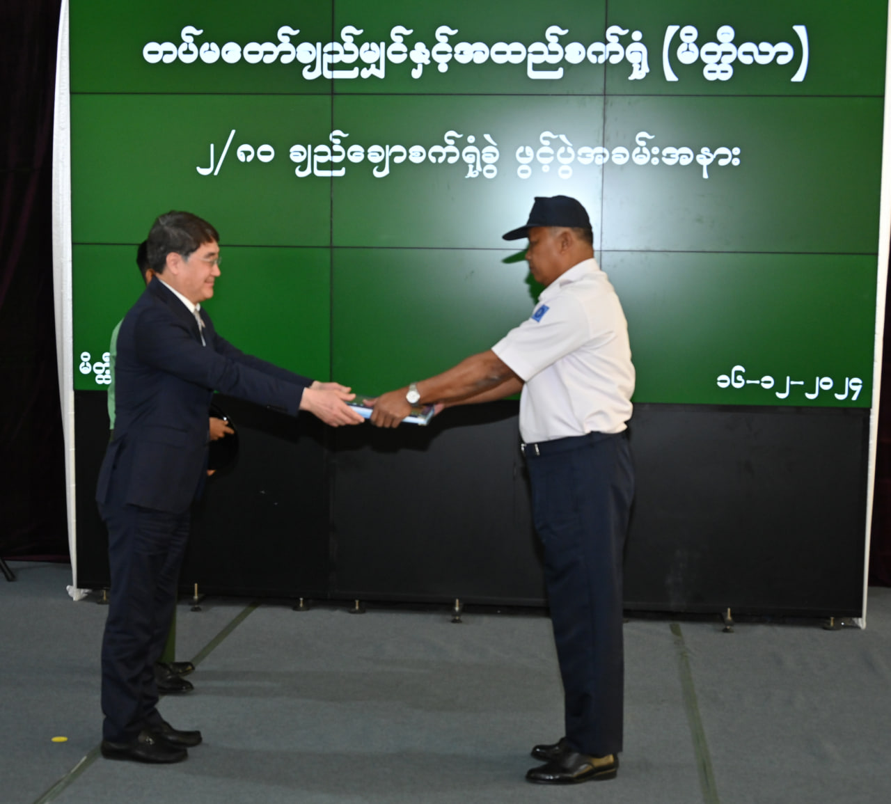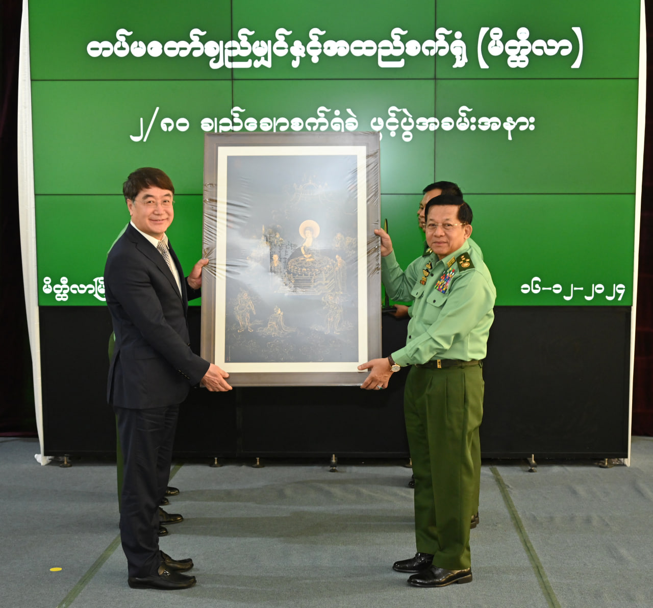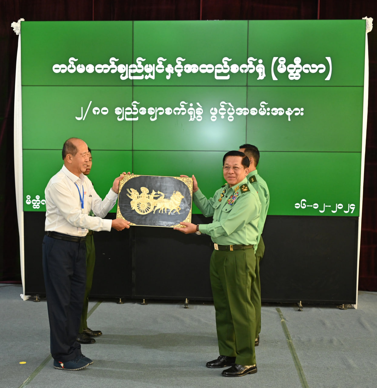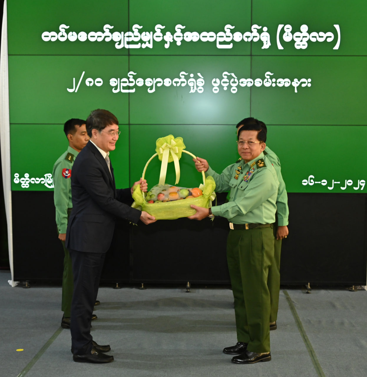 ထို့နောက် နိုင်ငံတော်စီမံအုပ်ချုပ်ရေးကောင်စီဥက္ကဋ္ဌ တပ်မတော်ကာကွယ်ရေးဦးစီးချုပ်က စက်ရုံတည်ဆောက်ရာတွင်ပါဝင်ခဲ့သည့် CTMTC ကုမ္ပဏီမှ တာဝန်ရှိသူတစ်ဦးအား သစ်သီးခြင်းနှင့် အမှတ်တရလက်ဆောင်ပေးအပ်ပြီး၊ CTMTC ကုမ္ပဏီမှ တာဝန်ရှိသူတစ်ဦးက နိုင်ငံတော်စီမံအုပ်ချုပ်ရေးကောင်စီဥက္ကဋ္ဌ တပ်မတော်ကာကွယ်ရေးဦးစီးချုပ်ထံ ဂါရဝပြုလက်ဆောင် ပြန်လည်ပေးအပ်သည်။
