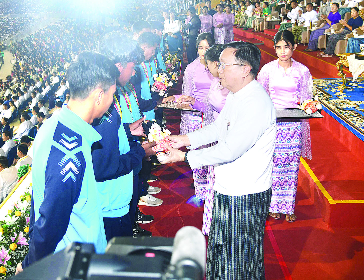 ၂ဝ၂၄ ခုနှစ်၊ ပဉ္စမအကြိမ်မြောက် အမျိုးသားအားကစားပွဲတော် ပိတ်ပွဲအခမ်းအနားကို ယနေ့ညနေပိုင်းတွင် နေပြည်တော်ရှိ ဝဏ္ဏသိဒ္ဓိအားကစားကွင်း၌ ကျင်းပပြုလုပ်ရာ နိုင်ငံတော်စီမံအုပ်ချုပ်ရေးကောင်စီဥက္ကဋ္ဌ နိုင်ငံတော်ဝန်ကြီးချုပ် ဗိုလ်ချုပ်မှူးကြီး မင်းအောင်လှိုင် တက်ရောက်ချီးမြှင့်ပြီး ဂုဏ်ပြုအမှာစကားပြောကြားသည်။