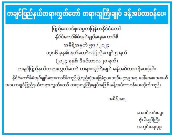ကချင်ပြည်နယ်တရားလွှတ်တော် တရားသူကြီးချုပ် ခန့်အပ်တာဝန်ပေး