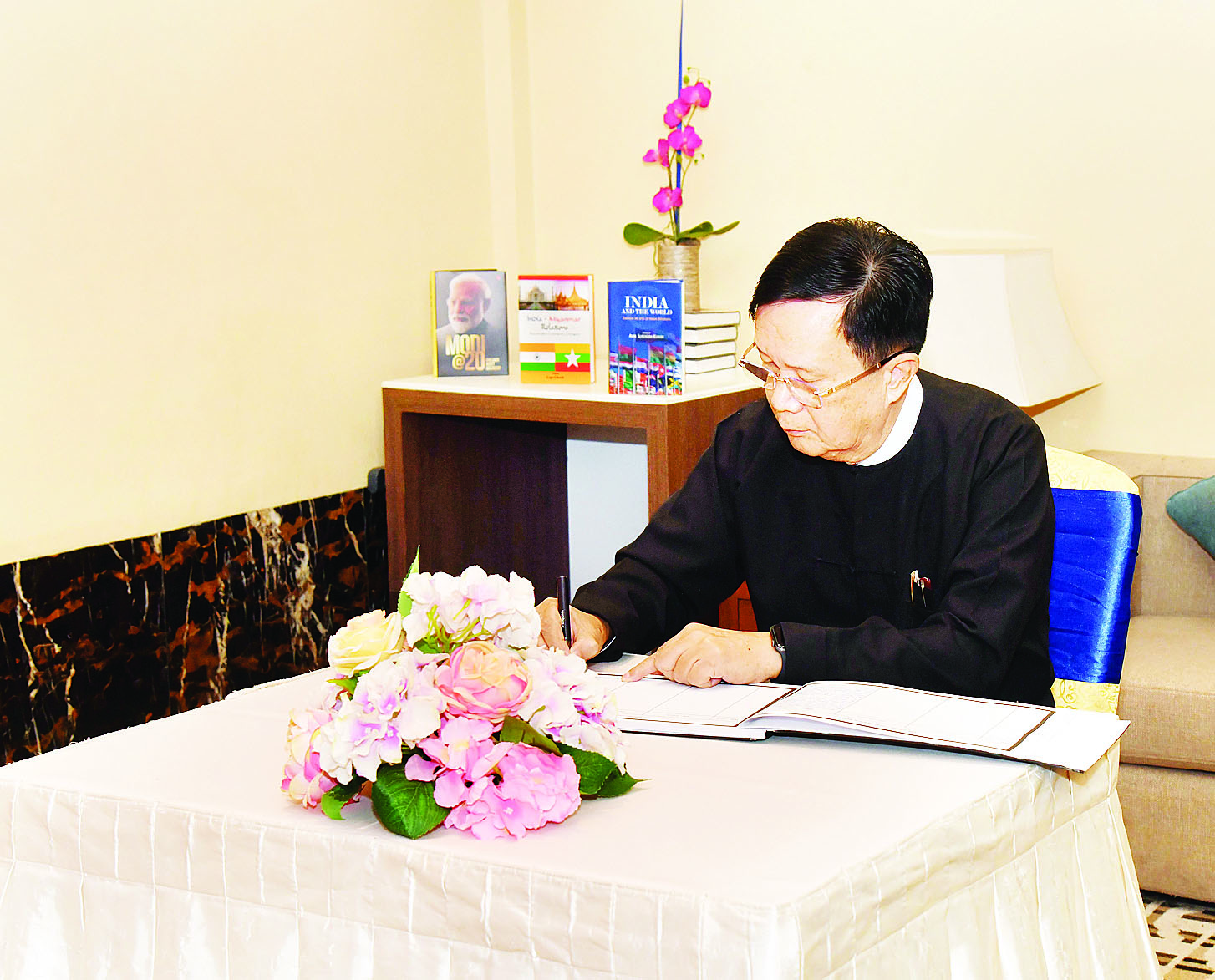 ထို့နောက် နိုင်ငံတော်စီမံအုပ်ချုပ်ရေးကောင်စီအတွင်းရေးမှူးသည် အိန္ဒိယသံရုံးမှ ပထမအတွင်းဝန်နှင့် အိန္ဒိယဆက်ဆံရေးရုံး အကြီးအကဲ မစ္စရီတူရာဒါ့ဗ်နှင့် တာဝန်ရှိသူများအား ခင်မင်ရင်းနှီးစွာတွေ့ဆုံ၍ အိန္ဒိယသမ္မတနိုင်ငံဝန်ကြီးချုပ်ဟောင်း ကွယ်လွန်ခဲ့ခြင်းအတွက် နိုင်ငံတော်စီမံအုပ်ချုပ်ရေးကောင်စီဥက္ကဋ္ဌ၏ ဝမ်းနည်းကြောင်း၊ စာနာထောက်ထားကြောင်း သတင်းစကားအားပြောကြားခဲ့ပြီး ဝမ်းနည်းခြင်းအထိမ်းအမှတ်စာအုပ်၌ လက်မှတ်ရေးထိုးသည်။