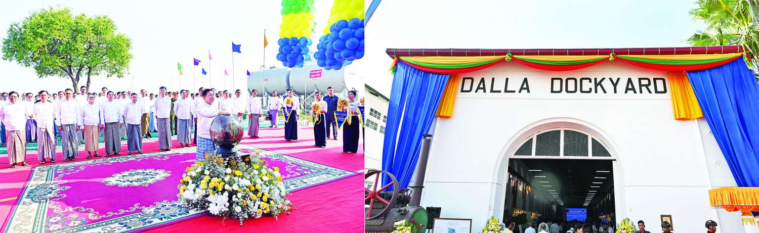ထို့နောက် နိုင်ငံတော်စီမံအုပ်ချုပ်ရေးကောင်စီဥက္ကဋ္ဌ နိုင်ငံတော်ဝန်ကြီးချုပ်နှင့် အဖွဲ့ဝင်များသည် သမိုင်းဝင် ဒလသင်္ဘောကျင်း လုပ်ငန်းခွင်အတွင်း အကြီးစားမွမ်းမံ ပြင်ဆင်လျက်ရှိသော ရေယာဉ်ကြီးများ၏ ပြင်ဆင်နေမှုအခြေအနေများ၊ ကမ်းရိုးတန်းသွား ကုန်တင်ရေယာဉ်တည်ဆောက်နိုင်ရေးအတွက် ရေယာဉ်ပုံစံငယ် စမ်းသပ်မှုလုပ်ငန်းစဉ် ရှင်းလင်းမှုများကို လှည့်လည်ကြည့်ရှုစစ်ဆေးပြီး တာဝန်ရှိသူများ၏ တင်ပြချက်များအပေါ် နိုင်ငံတော်စီမံအုပ်ချုပ်ရေးကောင်စီဥက္ကဋ္ဌ နိုင်ငံတော်ဝန်ကြီးချုပ်က လိုအပ်သည်များ လမ်းညွှန်မှာကြားသည်။