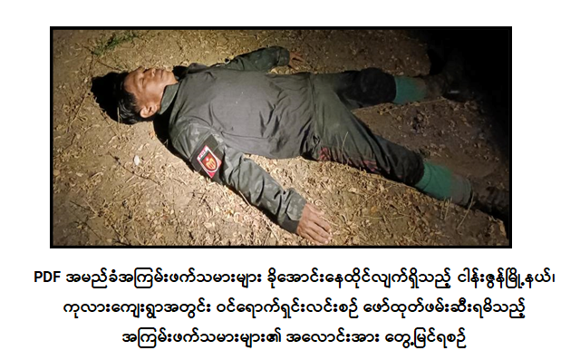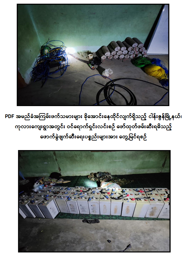 မန္တလေးတိုင်းဒေသကြီး၊ ငါန်းဇွန်မြို့နယ်၊ ကုလားကျေးရွာအတွင်းရှိ နေအိမ်နှင့်စာသင်ကျောင်းအတွင်း ခိုအောင်းနေထိုင်လျက်ရှိသည့် PDF အမည်ခံအကြမ်းဖက်သမားများနှင့် ၎င်းတို့သိုဝှက်သိမ်းဆည်းထားသည့် ဖောက်ခွဲရေးပစ္စည်းများ သိမ်းဆည်းရမိ