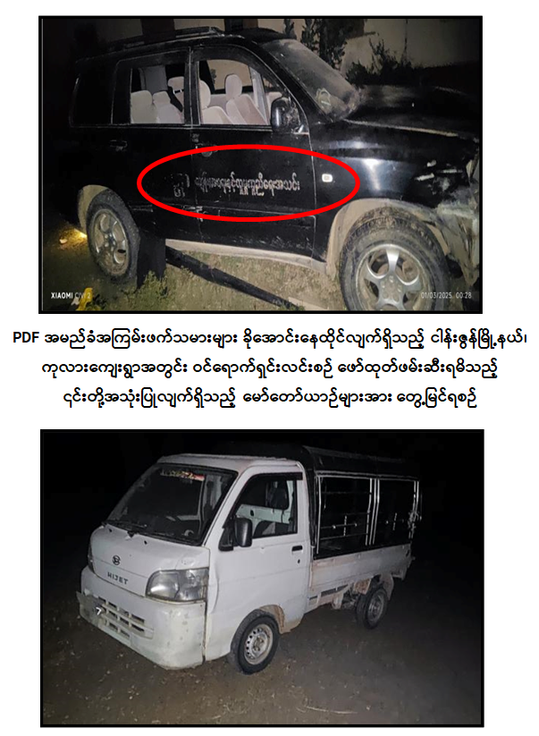 ထိုသို့ ဆောင်ရွက်ခဲ့ရာ ကျေးရွာအတွင်း ခိုအောင်းနေထိုင်လျက်ရှိသည့် PDF အမည်ခံအကြမ်းဖက်သမားနှင့် ရင်ဆိုင်ထိတွေ့မှုများဖြစ်ပွားခဲ့ပြီး အကြမ်းဖက်သမား ၃ ဦးကို အသေပစ်ခတ်ဖမ်းဆီးရမိခဲ့ကာ ၎င်းတို့ခိုအောင်းနေထိုင်လျက်ရှိသည့် နေအိမ်နှင့်စာသင်ကျောင်းအတွင်းမှ ဖောက်ခွဲဖျက်ဆီးရေးဆက်စပ်ပစ္စည်းများ၊ ၎င်းတို့အသုံးပြုလျက်ရှိသည့် ကျန်းမာရေးနှင့် လူမှုကူညီရေးအသင်းစာတမ်းပါ NISSAN XTRAIL အမျိုးအစား မော်တော်ယာဉ်တစ်စီးနှင့် Hijet အမျိုးအစား မော်တော်ယာဉ်တစ်စီးတို့ကို သိမ်းဆည်းရမိခဲ့သည်။