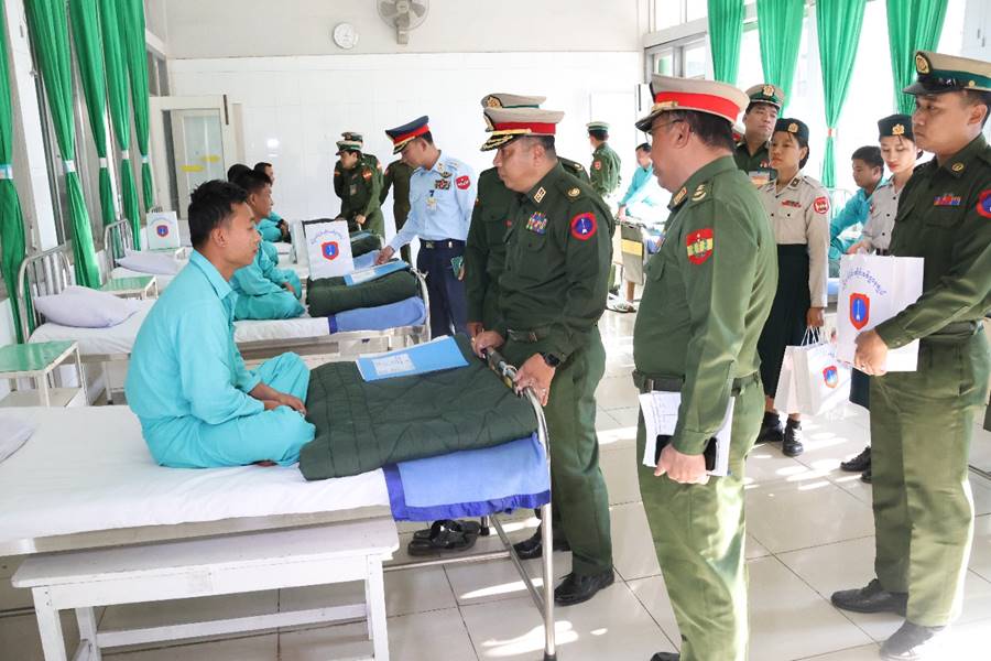 ကချင်ပြည်နယ်၊ မြစ်ကြီးနားမြို့ရှိ တပ်မတော်ဆေးရုံ၊ ရန်ကုန်တိုင်းဒေသကြီး၊ မင်္ဂလာဒုံမြို့နယ်ရှိ တပ်မတော်အရိုးရောဂါအထူးကုဆေးရုံကြီး (ခုတင်-၅၀၀) နှင့် တပ်မတော်ဆေးရုံကြီး (ခုတင်-၁၀၀၀)၊ စစ်ကိုင်းတိုင်းဒေသကြီး၊ ကလေးမြို့ရှိ တပ်မတော်ဆေးရုံတို့၌ တက်ရောက်ကုသမှုခံယူလျက်ရှိသော အရာရှိ၊ စစ်သည်၊ မိသားစုများ၊ စစ်မှုထမ်းဟောင်းအဖွဲ့ဝင်များ၊ မြန်မာနိုင်ငံရဲတပ်ဖွဲ့ဝင်များ၊ ပြည်သူ့စစ် (ဌာနေ) တပ်ဖွဲ့ဝင်များနှင့် ဒေသခံပြည်သူများအား ယနေ့တွင် သက်ဆိုင်ရာတိုင်းစစ်ဌာနချုပ်များမှ တိုင်းမှူးများနှင့်တာဝန်ရှိသူများက သွားရောက်ကြည့်ရှု၍ တစ်ဦးချင်း၏ရောဂါဖြစ်ပွားမှု၊ ဆေးဝါးကုသပေးထားမှုနှင့် ကျန်းမာရေးတိုးတက်ကောင်းမွန်မှု အခြေအနေများကို မေးမြန်းအားပေးစကားပြောကြားပြီး အာဟာရဖြည့်စားသောက်ဖွယ်ရာများနှင့် ချီးမြှင့်ငွေများပေးအပ်သည်။