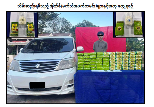 မူးယစ်ဆေးဝါးတားဆီးနှိမ်နင်းရေးရဲတပ်ဖွဲ့မှ တပ်ဖွဲ့ဝင်များပါဝင်သော ပူးပေါင်းအဖွဲ့သည် ၂၀၂၄ ခုနှစ်၊ ဒီဇင်ဘာလ ၃၀ ရက်နေ့ ညနေ ၃ နာရီခွဲအချိန် ရှမ်းပြည်နယ် (အရှေ့ပိုင်း)၊ ကျိုင်းတုံမြို့နယ်၊ ယန်းလောကျေးရွာအုပ်စု၊ ကျိုင်းဖောင်းကျေးရွာအနီးတွင် မိုင်းပျဉ်းမှကျိုင်းတုံဘက်သို့ စိုင်းထွန်းကျောက်မောင်းနှင်လာသည့် TOYOTA ALPHARD မော်တော်ယာဉ်ကို သတင်းအရရှာဖွေရာ ယာဉ်၏ကြမ်းခင်းအံဝှက်အတွင်း သိုဝှက်သယ်ဆောင်လာသည့် ဒေသကာလတန်ဖိုးငွေကျပ်သိန်း ၄,၈၀၀ တန်ဖိုးရှိ အိုက်စ် (မက်သ်အဖက်တမင်း) ၆၀ ကီလို သိမ်းဆည်းရမိခဲ့ပြီး စစ်ဆေးဖော်ထုတ်ချက်အရ သိမ်းဆည်းရမိ အိုက်စ်(မက်သ်အဖက်တမင်း)များအား မိုင်းပျဉ်းမြို့နယ်မှတာချီလိတ်မြို့နယ်သို့ သယ်ဆောင်ရောင်းဝယ်ခြင်းဖြစ်ကြောင်းသိရှိရသဖြင့် ၎င်းအား ဥပဒေအရအရေးယူထားရှိပြီး ကွင်းဆက်ပြစ်မှုကျူးလွန်သူများအား ဆက်လက်စစ်ဆေးဖော်ထုတ်လျက်ရှိကြောင်း မြန်မာနိုင်ငံရဲတပ်ဖွဲ့မှ သတင်းရရှိသည်။