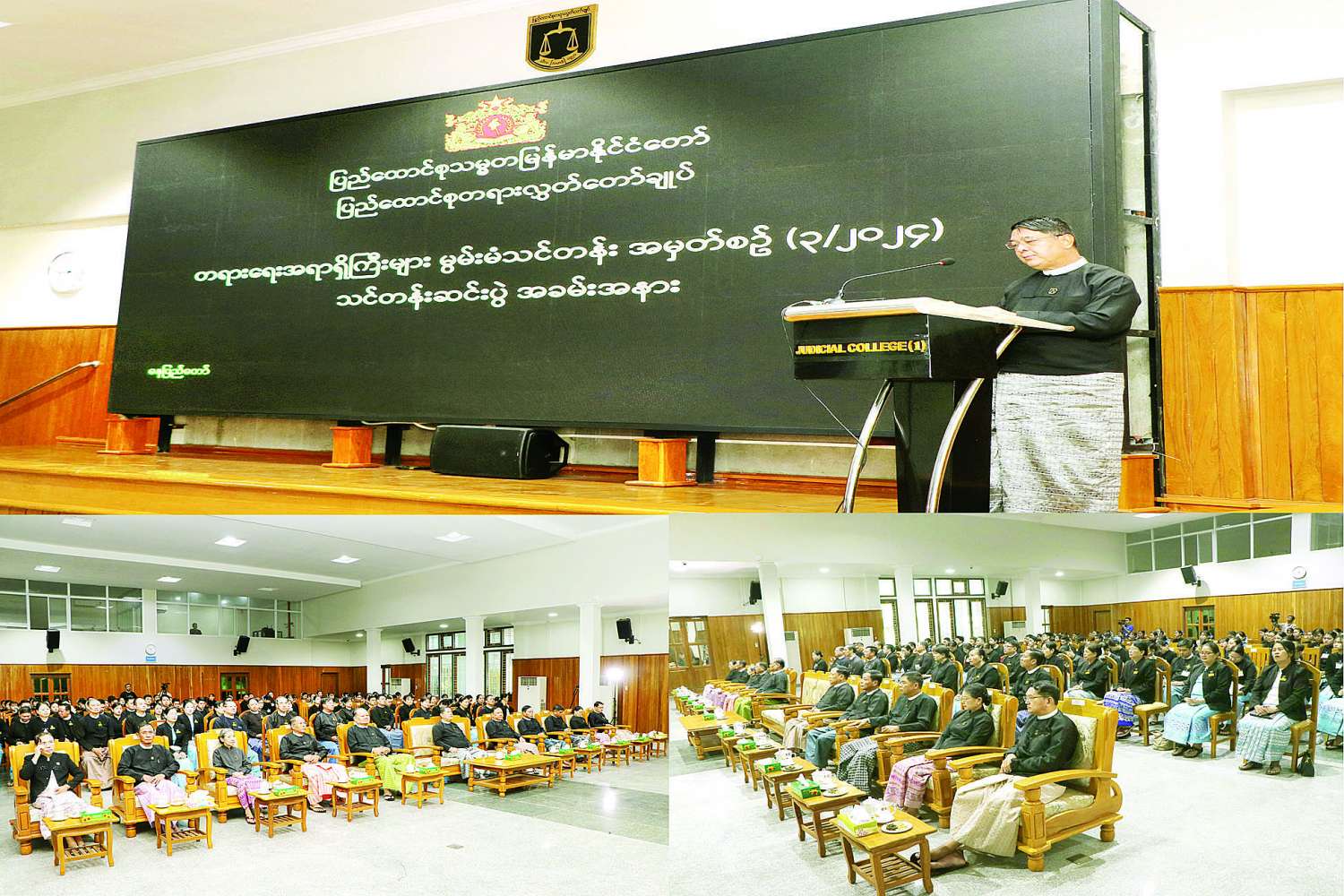 တရားရေးအရာရှိကြီးများမွမ်းမံသင်တန်း အမှတ်စဉ် (၃/၂၀၂၄) သင်တန်း ဆင်းပွဲ အခမ်းအနားကို ဒီဇင်ဘာ ၂၇ ရက် နံနက်ပိုင်းက ပြည်ထောင်စုတရားလွှတ်တော်ချုပ် Judicial College ၌ကျင်းပရာ ပြည်ထောင်စုတရားသူကြီးချုပ် ဦးသာဌေးတက်ရောက်၍ သင်တန်းဆင်းအမှာစကားပြောကြားသည်။