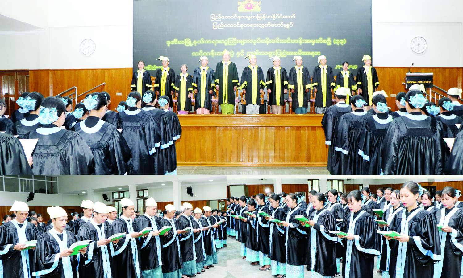 ဒုတိယမြို့နယ် တရားသူကြီးများ လုပ်ငန်းဝင်သင်တန်း အမှတ်စဉ် (၃၃) သင်တန်းဆင်းပွဲနှင့် ကျမ်းသစ္စာပြုပွဲ အခမ်းအနားကို ဒီဇင်ဘာ ၂၇ ရက် နံနက်ပိုင်းက ပြည်ထောင်စုတရားလွှတ်တော် ချုပ် Judicial College ၌ကျင်းပရာ ပြည်ထောင်စုတရားသူကြီးချုပ် ဦးသာဌေးတက်ရောက်၍ သင်တန်းဆင်းအမှာစကားပြောကြားခဲ့သည်။