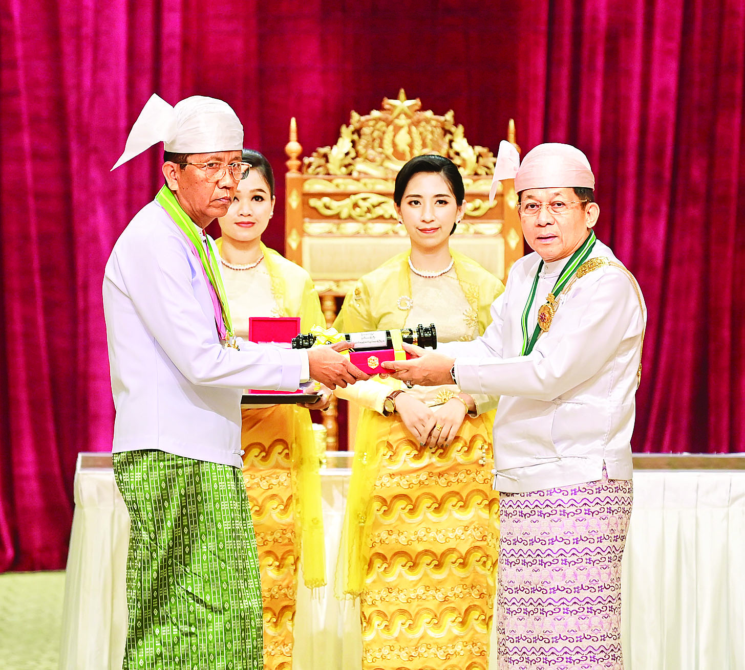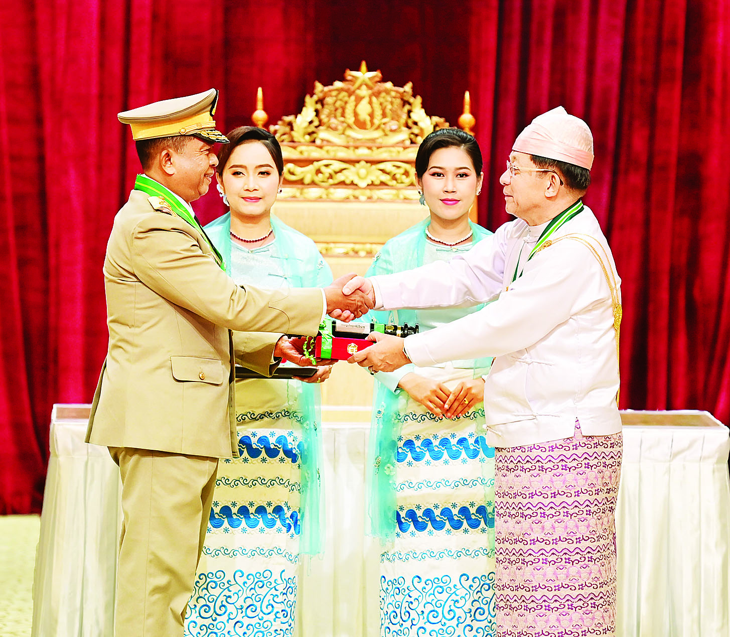 နိုင်ငံတော်စီမံအုပ်ချုပ်ရေးကောင်စီဥက္ကဋ္ဌ နိုင်ငံတော်ဝန်ကြီးချုပ် ဗိုလ်ချုပ်မှူးကြီး သတိုးမဟာသရေစည်သူ သတိုးသီရိသုဓမ္မ မင်းအောင်လှိုင် (၇၇)နှစ်မြောက်လွတ်လပ်ရေးနေ့အထိမ်းအမှတ် ဂုဏ်ထူးဆောင်ဘွဲ့များ ချီးမြှင့်အပ်နှင်းခြင်းအခမ်းအနားသို့ တက်ရောက်ချီးမြှင့်