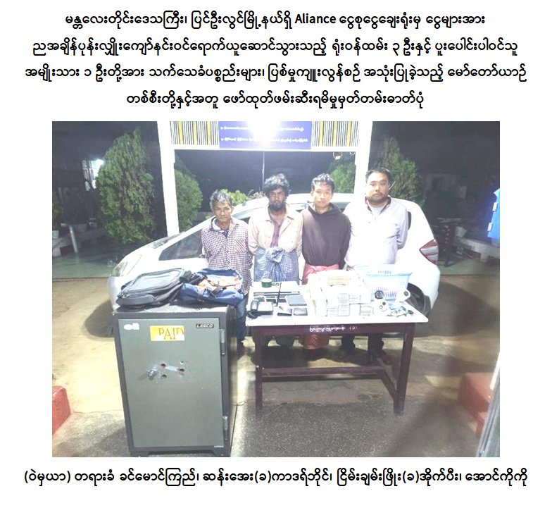 ၂၀၂၅ ခုနှစ်၊ ဇန်နဝါရီလ ၉ ရက်နေ့ နေ့လယ် ၁၂ နာရီတွင် မန္တလေးတိုင်းဒေသကြီး၊ ပြင်ဦးလွင်မြို့နယ်၊ ရပ်ကွက်ကြီး (၉)၊ ပွေးတောင်ရပ်ကွက်နေ Aliance ငွေစုငွေချေးရုံးမှ မန်နေဂျာ ဖြစ်သူ ဦးဇော်ဇော်အောင်သည် ရပ်ကွက်ကြီး (၆)၊ သစ်တောလမ်းနှင့် ချယ်ရီလမ်းထောင့်ရှိ Aliance ငွေစုငွေချေးရုံးသို့ ရောက်ရှိစဉ် ရုံးညစောင့်ဖြစ်သူ ပြင်ဦးလွင်မြို့နယ်၊ ရပ်ကွက်ကြီး (၇)၊ သာယာကုန်းကျေးရွာနေ ဦးခင်မောင်ကြည် (၅၉) နှစ်၊ (ဘ) ဦးကြည်၏ ပြောပြချက်အရ ဇန်နဝါရီလ ၈ ရက်နေ့ ည ၁၂ နာရီခွဲတွင် ၎င်းမှငွေစုငွေချေးရုံး၌ ညစောင့်တာဝန်ဆောင်ရွက်နေစဉ် အနက်ရောင်ဘောင်းဘီရှည်၊ အနက်ရောင်အနွေးထည်အင်္ကျီဝတ်ထားသူ အမည်မသိအမျိုးသား ၂ ဦးက ယာဉ်အမှတ် 1E/ 2737 HONDA FIT အမျိုးအစား အဖြူရောင်မော်တော်ယာဉ်ဖြင့် ရောက်ရှိလာပြီး ဧည့်စာရင်းစစ်ဆေးမည်ဟု ပြောဆို၍ ရုံးခြံဝင်းအတွင်းသို့ဝင်လာကာ ရုံးပြူတင်းပေါက် သံပန်းတံခါးအား သံချောင်းဖြင့် ကန့်လန့်ဖွင့်၍ ရုံးခန်းအတွင်းထားရှိသည့် မြန်မာငွေစက္ကူရောရာ ငွေ (၁၀၀,၃၀၂,၄၀၀) ကျပ်ထည့်ထားသည့် LECCO တံဆိပ်ပါ မီးခံသေတ္တာ ၁ လုံးနှင့် ရုံးအတွင်းတပ်ဆင်ထားသည့် CCTV ကြိုးများအားဖြတ်တောက်၍ CCTV မှတ်တမ်းအထိုင်စက်တို့အား ယူဆောင်သွားခဲ့ကြောင်း သိရှိရသဖြင့် ပြင်ဦးလွင်မြို့မရဲစခန်းသို့ လာရောက်သတင်းပို့တိုင်တန်းခဲ့ရာ ကျူးလွန်သူတရားခံများအား ဖမ်းဆီးရမိနိုင်ရေး ပြင်ဦးလွင်မြို့မရဲစခန်း(ပ)၉/၂၀၂၅၊ ရာဇသတ်ကြီးပုဒ်မ ၄၅၇/၁၁၅ ဖြင့် အမှုဖွင့်စုံစမ်း စစ်ဆေးခဲ့သည်။