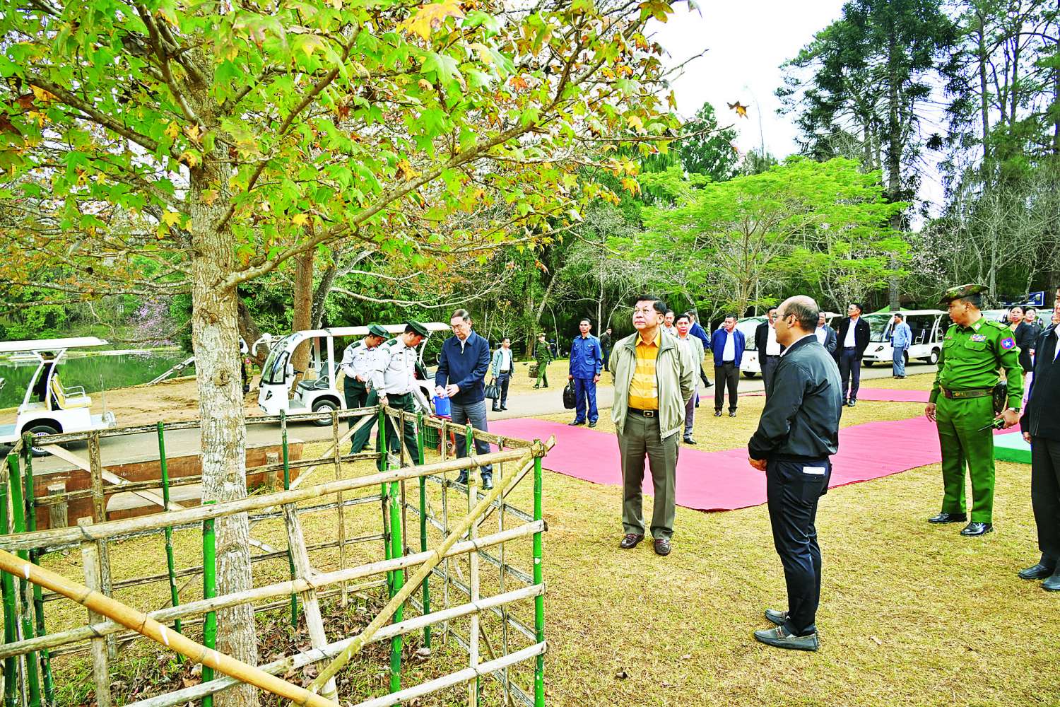 ထို့နောက် ဥယျာဉ်အတွင်းရှိ နှစ် ၁၀၀ နီးပါး သက်တမ်းရှိသော ဂင်ဂိုပင် (Ginkgo Biloba) (ကမ္ဘာဦးပင်)အား ကြည့်ရှုပြီး စနစ်တကျထိန်းသိမ်းဆောင်ရွက်သွားရန် တာဝန်ရှိသူများကို မှာကြားသည်။ အဆိုပါ ဂင်ဂိုပင် (Ginkgo Biloba)သည် တရုတ်နိုင်ငံ၊ ဂျပန်နိုင်ငံနှင့်အနောက်နိုင်ငံများတွင် ထင်ရှားကျော်ကြားသည့် အပင်မျိုးစိတ်တစ်ခုဖြစ်ကြောင်း၊ တရုတ်နိုင်ငံအတွင်းရှိ ပြည်နယ်အများအပြား၌ ဆောင်းဦးရာသီတွင် အဝါရောင်အရွက်များ ဖုံးလွှမ်းလျက်ရှိသည့် ဂင်ဂိုပင်များကိုတွေ့ရှိရနိုင်ပြီး အချို့အပင်များသည် နှစ်ပေါင်းထောင်ချီသက်တမ်းရှိပြီဖြစ်ကြောင်း သိရှိရသည်။