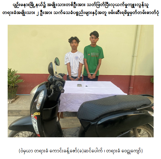 ဆက်လက်၍ ပြစ်မှုကျူးလွန်သူတရားခံများအား ဖော်ထုတ်ဖမ်းဆီးရမိနိုင်ရေး ဆောင်ရွက်ခဲ့ရာ နယ်မြေအတွင်း မိမိအမာခံသတင်းပေးများထံမှ ရရှိသော အချက်အလက်များနှင့် အခင်းဖြစ်ရပ်အထောက်အထားများအရ ဇန်နဝါရီလ ၁၂ ရက်နေ့ညပိုင်းတွင် တရားခံ ပျဉ်းမနားမြို့နယ်၊ မြို့သစ်ရပ်ကွက်နေ ဝေဠုကျော် (၂၀) နှစ် (ဘ) ဦးမျိုးအောင်နှင့် သဲကျွန်းကျေးရွာနေ ကောင်းခန့်ဇော် (ခ) ဆင်ပေါက် (၁၆) နှစ် (ဘ) ဦးသိန်းလွင်တို့ ၂ ဦးတို့အား ၎င်းတို့၏နေအိမ်အသီးသီး၌ ဖမ်းဆီးရမိခဲ့ပြီး အခင်းဖြစ်စဉ်က လုယက်ယူဆောင်သွားခဲ့သည့် သက်သေခံ Scoppy အမျိုးအစား ဆိုင်ကယ် ၁ စီးနှင့် Infinix အမျိုးအစားလက်ကိုင်ဖုန်း ၁ လုံးတို့အား သိမ်းဆည်းရမိခဲ့သည်။