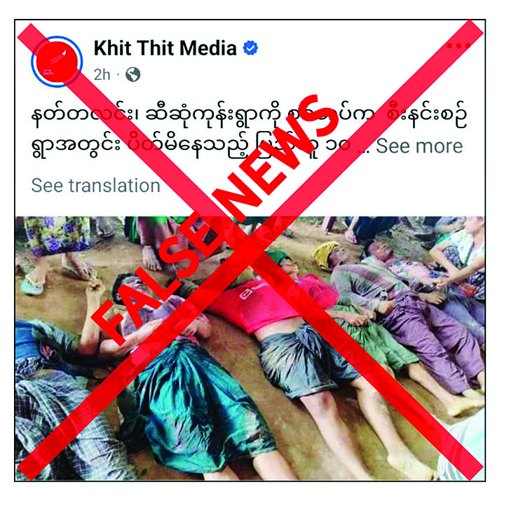 ပဲခူးတိုင်းဒေသကြီး နတ်တလင်းမြို့နယ် ဆီဆုံကုန်းကျေးရွာကို ဇန်နဝါရီ ၁၅ ရက်တွင် လုံခြုံရေးတပ်ဖွဲ့ဝင်များက ဝင်ရောက်စီးနင်းပြီး ပြည်သူ ၁၀ ဦးကျော်ကို ဖမ်းဆီးသတ်ဖြတ်ခဲ့ကြောင်း တရားမဝင် ပြည်ဖျက်မီဒီယာများက သတင်းတု၊ သတင်းအမှားများဖြင့် လူမှုကွန်ရက်စာမျက်နှာများတွင် မဟုတ်မမှန် လှုံ့ဆော်ဝါဒဖြန့်ဝေနေသည်ကို တွေ့ရှိရသည်။