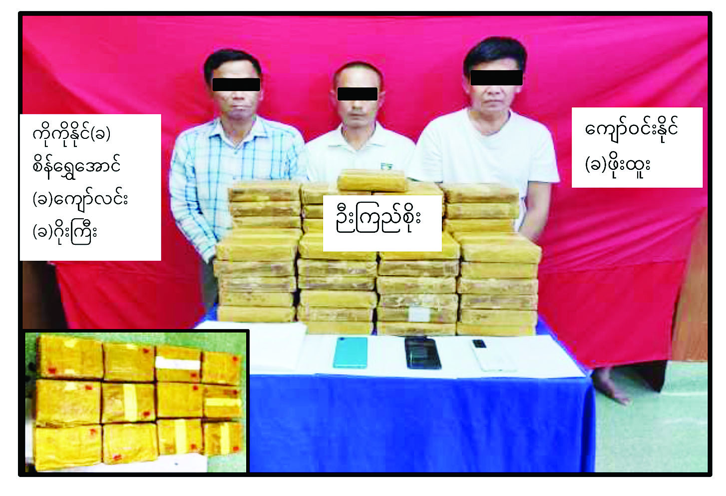 မူးယစ်ဆေးဝါးတားဆီးနှိမ်နင်းရေးရဲတပ်ဖွဲ့မှ တပ်ဖွဲ့ဝင်များ ပါဝင် သော ပူးပေါင်းအဖွဲ့သည် ဇန်နဝါရီ ၁၄ ရက် မွန်းလွဲ ၃ နာရီတွင် ရန်ကုန်တိုင်းဒေသကြီး လှိုင်မြို့နယ် (၁၆) ရပ်ကွက် မာလာမြိုင် (၆)လမ်းထိပ်တွင် ဦးမောင်မြင့်စိုး (ခ) ခိုင်ကျော်မင်း (ခ) ကိုမင်း၊ ဝင်းဗိုလ် (ခ) ဦးရခိုင်နှင့် ဦးမောင်မိုးညွန့် (ခ) မိုးချေတို့သုံးဦးအား သတင်းအရရှာဖွေရာ ၎င်းတို့သယ်ဆောင်လာသည့် ခရီးဆောင်အိတ်နှစ်လုံးအတွင်းမှ အိုက်စ် (မက်သ်အဖက်တမင်း) ကီလို ၂၀ သိမ်းဆည်းရမိခဲ့ပြီး ကွင်းဆက် ဖော်ထုတ်ချက်အရ ဇန်နဝါရီ ၁၆ ရက် နံနက် ၁ နာရီတွင် လှည်းကူးမြို့နယ် ဂွေးတောက်အိုင်ကျေးရွာအုပ်စု ဒေါင်းမြီးကွက်ကျေးရွာတွင် ကိုကိုနိုင် (ခ) စိန်ရွှေအောင် (ခ) ကျော်လင်း (ခ) ဂိုးကြီးနှင့် ဦးကြည်စိုးတို့အား စိတ်ကြွရူးသွပ်ဆေးပြား ၃ ဒသမ ၆၆ သိန်းနှင့်အတူ ဆက်လက်ဖမ်းဆီးရမိခဲ့ပြီး ဇန်နဝါရီ ၁၇ ရက် မွန်းလွဲ ၁၂ နာရီတွင် သိမ်းဆည်းရမိ စိတ်ကြွရူးသွပ်ဆေးပြားများပိုင်ရှင် ကျော်ဝင်းနိုင် (ခ) ဖိုးထူးအား ဇမ္ဗူသီရိမြို့နယ်သပြေကုန်းဈေးတွင် ထပ်မံဖမ်းဆီးရမိခဲ့သဖြင့် စုစုပေါင်းဒေသ ကာလတန်ဖိုးငွေကျပ်သိန်း ၈၆၆၀ တန်ဖိုးရှိ အိုက်စ် (မက်သ်အဖက်တမင်း) ကီလို ၂၀ နှင့် စိတ်ကြွရူးသွပ်ဆေးပြား ၃ ဒသမ ၆၆ သိန်း ဖမ်းဆီးရမိခဲ့သည်။