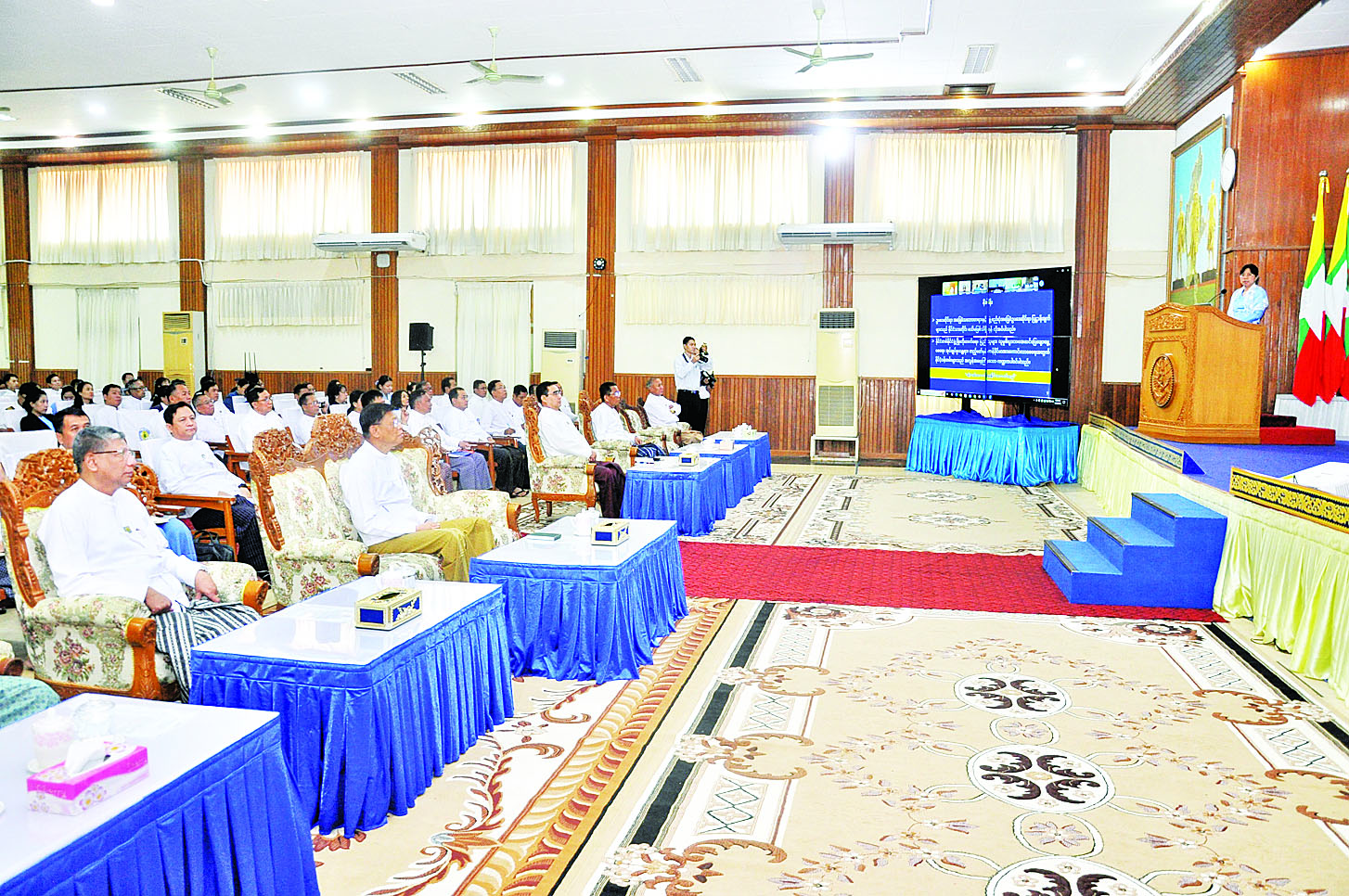 ပို့ဆောင်ရေးနှင့်ဆက်သွယ်ရေးဝန်ကြီးဌာန၌ တာဝန်ထမ်းဆောင်လျက်ရှိသော နိုင်ငံ့ဝန်ထမ်းများအတွက် ဥပဒေအသိပညာပေးဟောပြောပွဲကို ယနေ့နံနက်ပိုင်းက နေပြည်တော်ရှိ အဆိုပါဝန်ကြီးဌာန၌ကျင်းပပြုလုပ်ရာ နိုင်ငံတော်စီမံအုပ်ချုပ်ရေးကောင်စီအဖွဲ့ဝင် ဒုတိယဝန်ကြီးချုပ်နှင့် ပို့ဆောင်ရေးနှင့်ဆက်သွယ်ရေးဝန်ကြီးဌာန ပြည်ထောင်စုဝန်ကြီး ဗိုလ်ချုပ်ကြီး မြထွန်းဦးနှင့် ဒုတိယဝန်ကြီးများ၊ ဌာနအကြီးအကဲများ၊ အရာထမ်း၊ အမှုထမ်းများတက်ရောက်ကြပြီး နေပြည်တော် ပြင်ပဌာနများမှ ဝန်ထမ်များက ဗီဒီယိုကွန်ဖရင့်ဖြင့် တက်ရောက်ကြသည်။