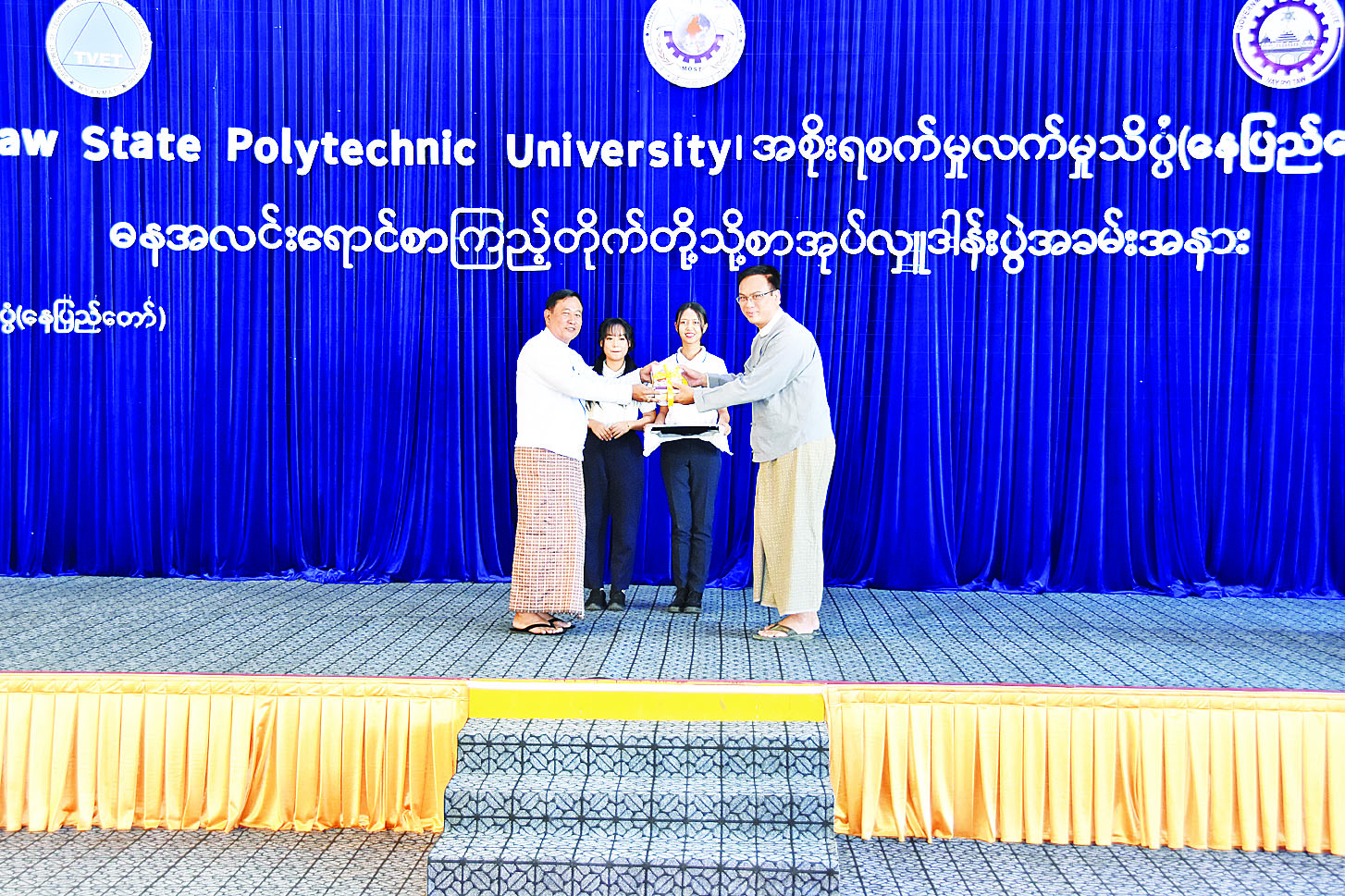 ထို့နောက် စာအုပ်လှူဒါန်းပွဲအခမ်းအနားကို ဆက်လက်ကျင်းပရာ အစိုးရစက်မှုလက်မှုသိပ္ပံ (နေပြည်တော်) မှ ကျောင်းသား ကျောင်းသူများက ထာဝရသစ္စာသီချင်းဖြင့် ကပြဖျော်ဖြေကြပြီး ဒုတိယဝန်ကြီးက စာအုပ်များလှူဒါန်းရခြင်းနှင့်စပ်လျဉ်း၍ ရှင်းလင်းပြောကြားကာ သိပ္ပံနှင့်နည်းပညာ သက်မွေးပညာနှင့် လေ့ကျင့်ရေးဦးစီးဌာန ညွှန်ကြားရေးမှူးချုပ်က ကျေးဇူးတင်စကားပြောကြားသည်။