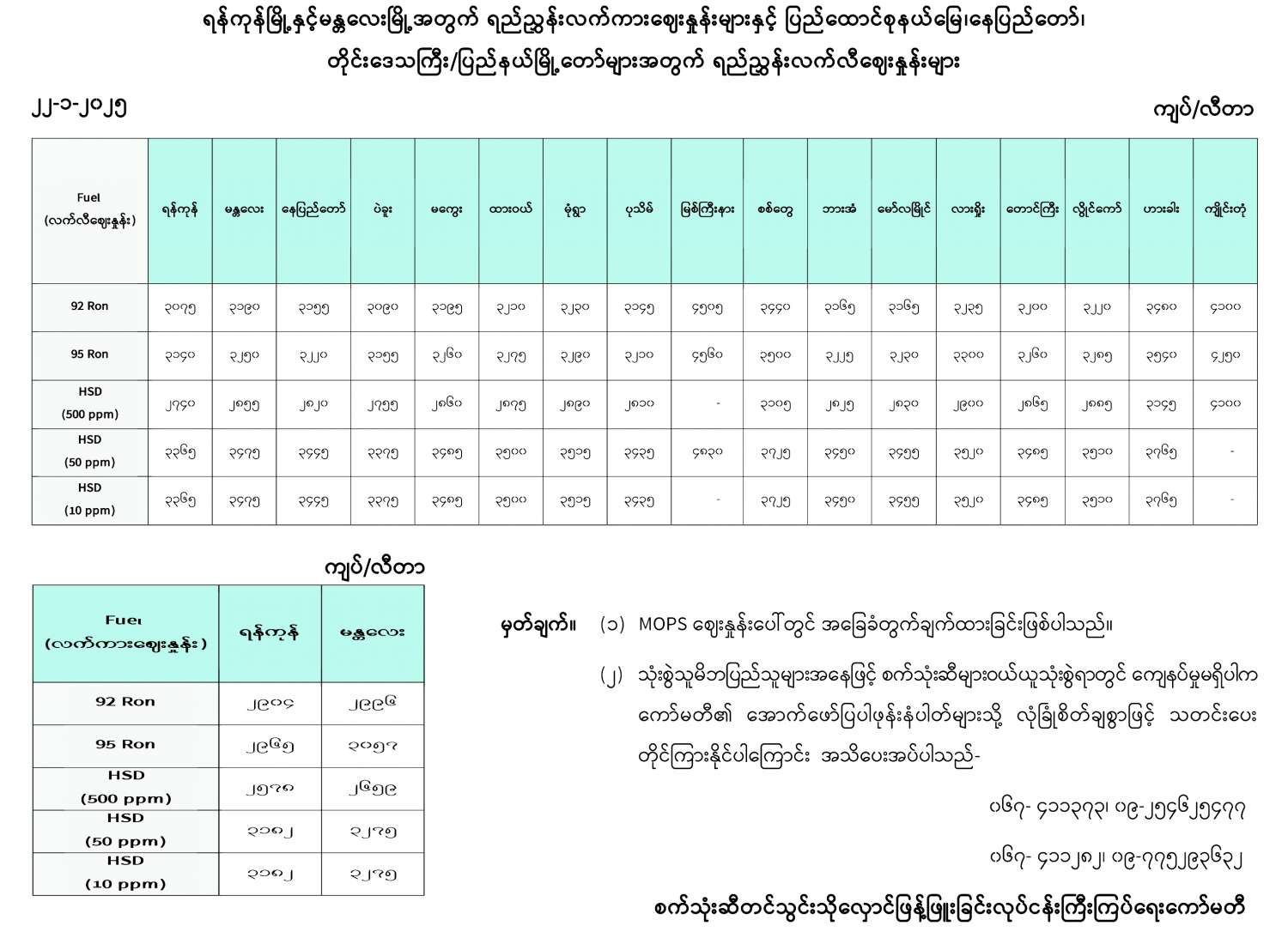 ရန်ကုန်မြို့နှင့် မန္တလေးမြို့အတွက် ရည်ညွှန်းလက်ကားဈေးနှုန်းများနှင့် ပြည်ထောင်စုနယ်မြေ နေပြည်တော်၊ တိုင်းဒေသကြီး/ပြည်နယ် မြို့တော်များအတွက် ရည်ညွှန်းလက်လီဈေးနှုန်းများ 01/22/2025