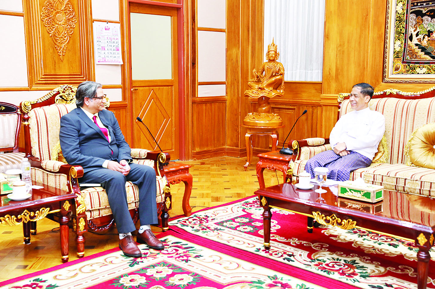 နိုင်ငံတော်စီမံအုပ်ချုပ်ရေးကောင်စီဥက္ကဋ္ဌရုံးဝန်ကြီးဌာန(၂) ပြည်ထောင်စုဝန်ကြီး ဦးကိုကိုလှိုင်သည် ကုလသမဂ္ဂလူသားချင်း စာနာထောက်ထားမှုဆိုင်ရာ ညှိနှိုင်းရေးရုံး (United Nations Office for the Coordination of Humanitarian Affairs-UNOCHA) ၏ မြန်မာနိုင်ငံဆိုင်ရာ အကြီးအကဲဖြစ်သူ Mr. Sajjad Mohammad Sajid အား ယနေ့မွန်းလွဲပိုင်းတွင် နေပြည်တော်ရှိ နိုင်ငံတော်စီမံအုပ်ချုပ်ရေးကောင်စီရုံး ဧည့်ခန်းမ၌ လက်ခံတွေ့ဆုံသည်။